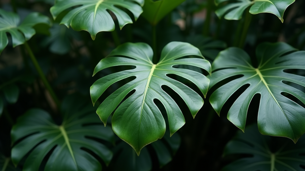 Lush green leaves of Monstera plant showcasing its unique holes.