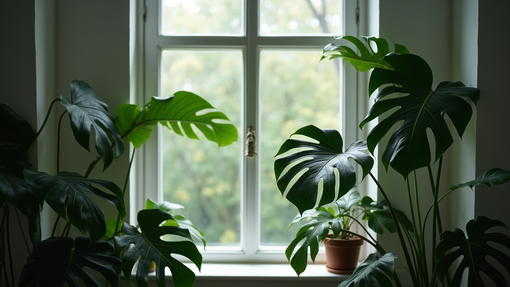 Monstera plants thriving by a window, soaking up optimal light.