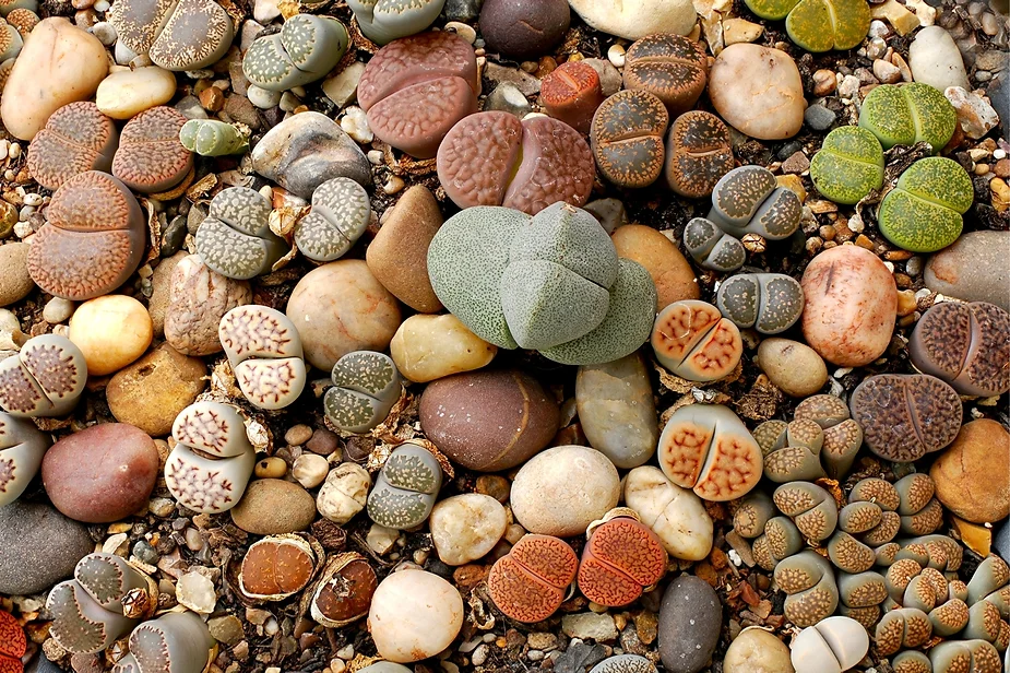 Within the succulent world, there are about 100 weird, chunky plants known as mesembs, which all mimic the appearance of rocks and stones, blending in with their harsh surroundings.