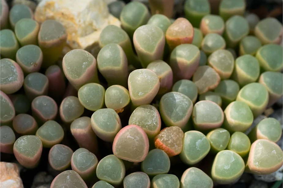 Dinteranthus is an unusual genus of plants that look like rocks, hailing from the Cape Province in South Africa and along the southeast corner of Namibia. With chunky opal, blue-white-green colored leaves that change color with the light, Dinteranthus resemble lithops.