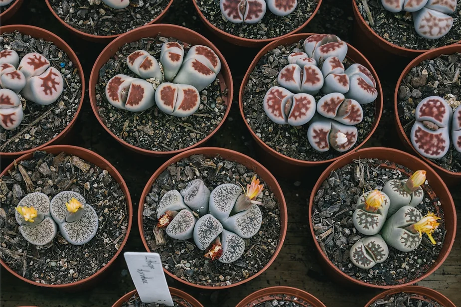 Lithops are native to Africa and consist of two simple thick leaves, most of which stay buried underground. There are hundreds of subspecies of lithops which means you can collect them in a wide variety of colors.