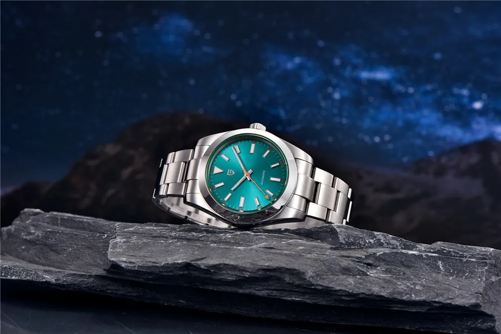 The PAGANI DESIGN Men’s Watch is more than just a timepiece—it’s a symbol of craftsmanship and sophistication. The NH35A mechanical movement ensures accurate timekeeping while eliminating the need for a battery. The green sapphire dial adds a pop of color, exuding modern style while maintaining durability with its scratch-resistant design.