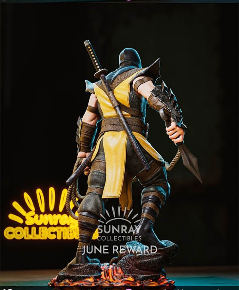 This figure is 3D printed, ensuring precision and fine detail in every part of the sculpture. The 3D printing technology allows for smooth surfaces and sharp contours, capturing the intricate armor and posture of Scorpion in stunning detail. Each piece is carefully designed to create a true-to-character representation of Scorpion as he appears in the Mortal Kombat games.