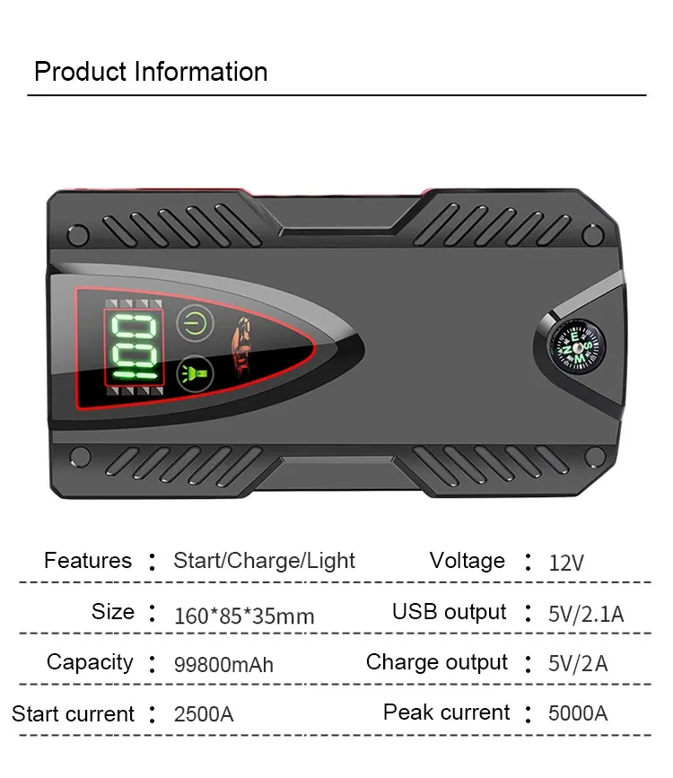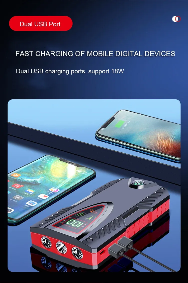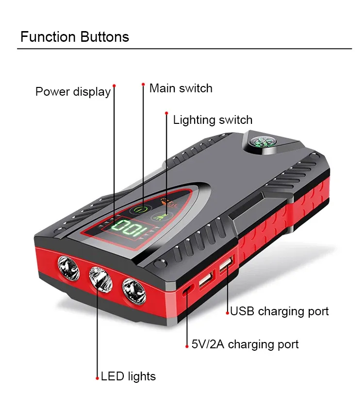 Beyond jump-starting your car, the 12V power supply can charge your electronic devices, making it a useful tool for various emergency situations.