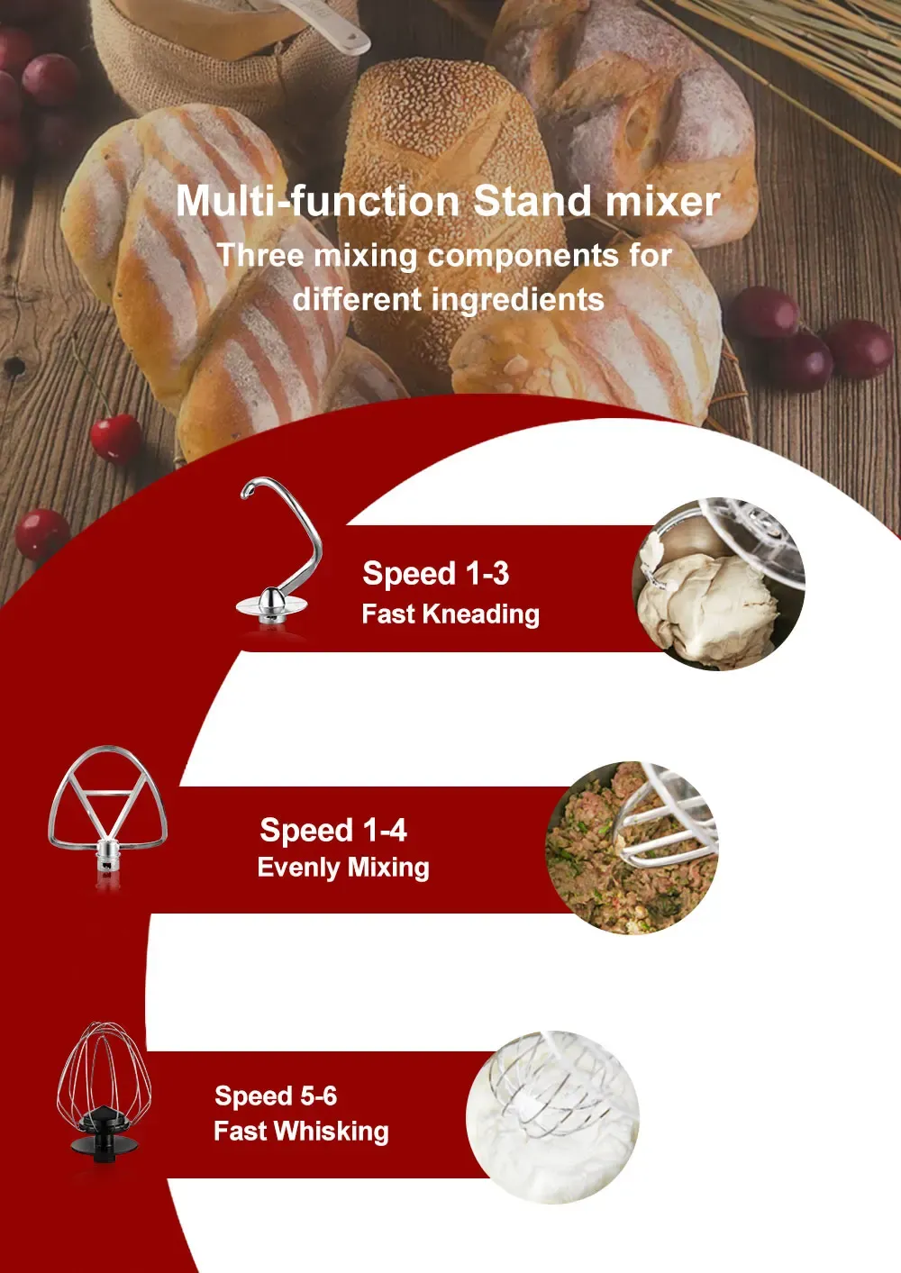 Dough hook: the hook mixes and kneads yeast dough with ease, saving you both the time and effort of hand kneading