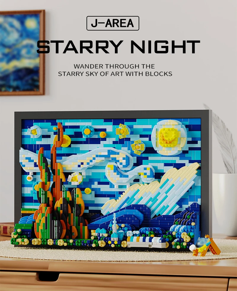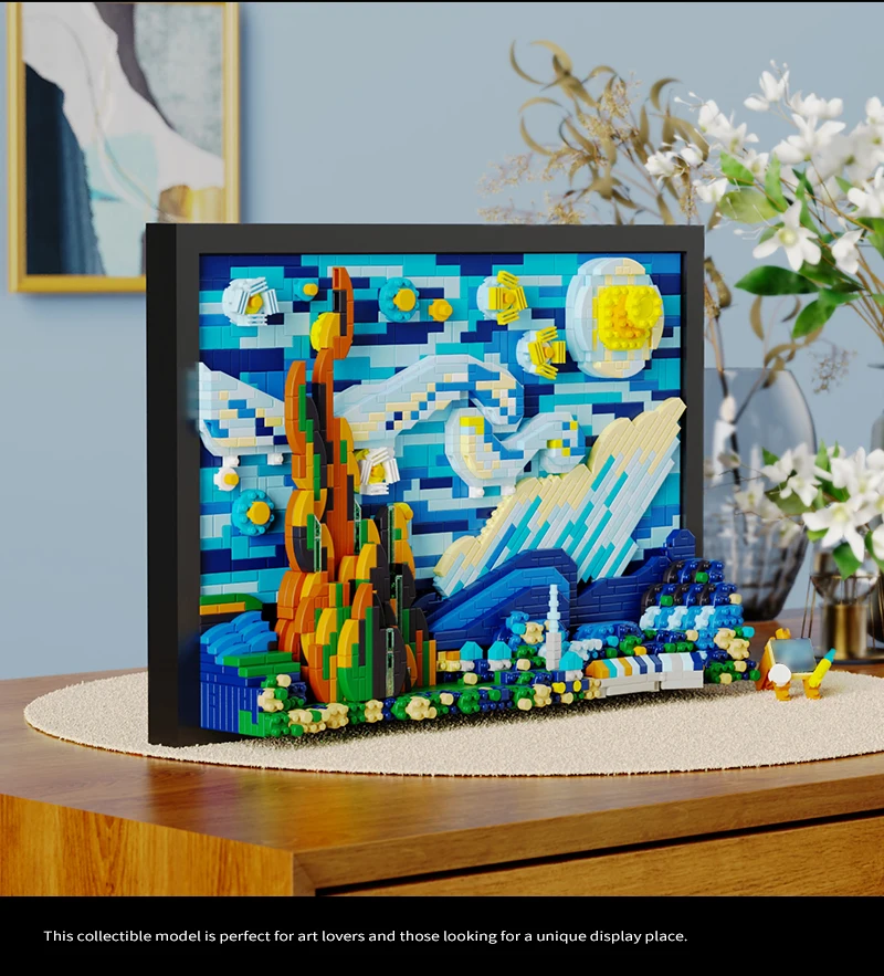 Once completed, the Starry Night building block model serves as an exquisite piece of home decor. Whether you choose to display it in your living room, study, or office, it adds a sophisticated artistic touch to any space. It’s an ideal decoration for art lovers and collectors who want to bring a touch of Van Gogh’s genius into their home.