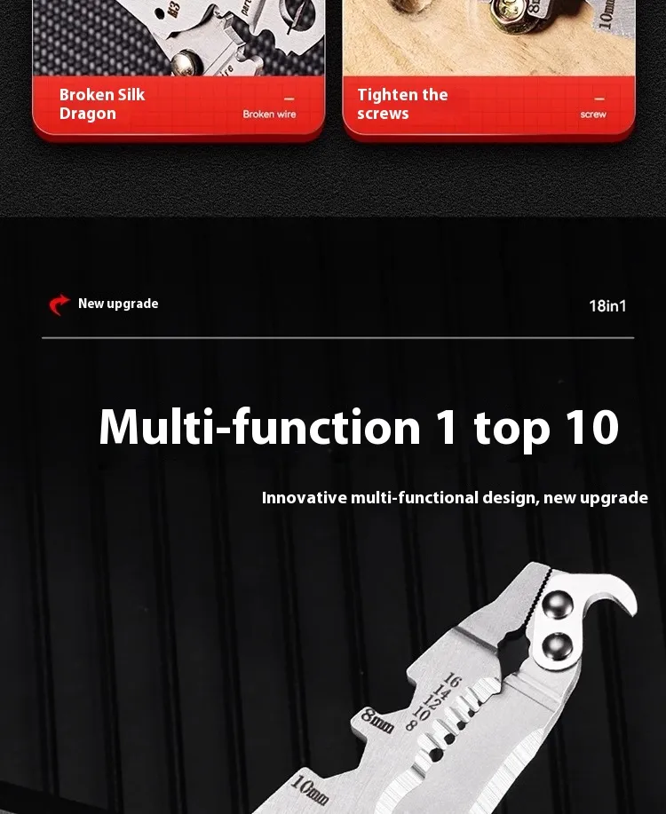 The 18-in-1 Multifunctional Folding Pliers are a versatile multi-tool built to handle a wide range of everyday tasks with ease. At its core, it functions as a strong, reliable pair of pliers, while folding out to reveal multiple integrated tools that support cutting, tightening, shaping, and basic repairs.