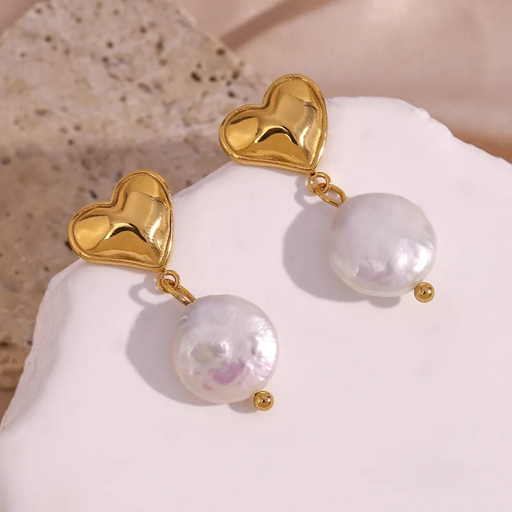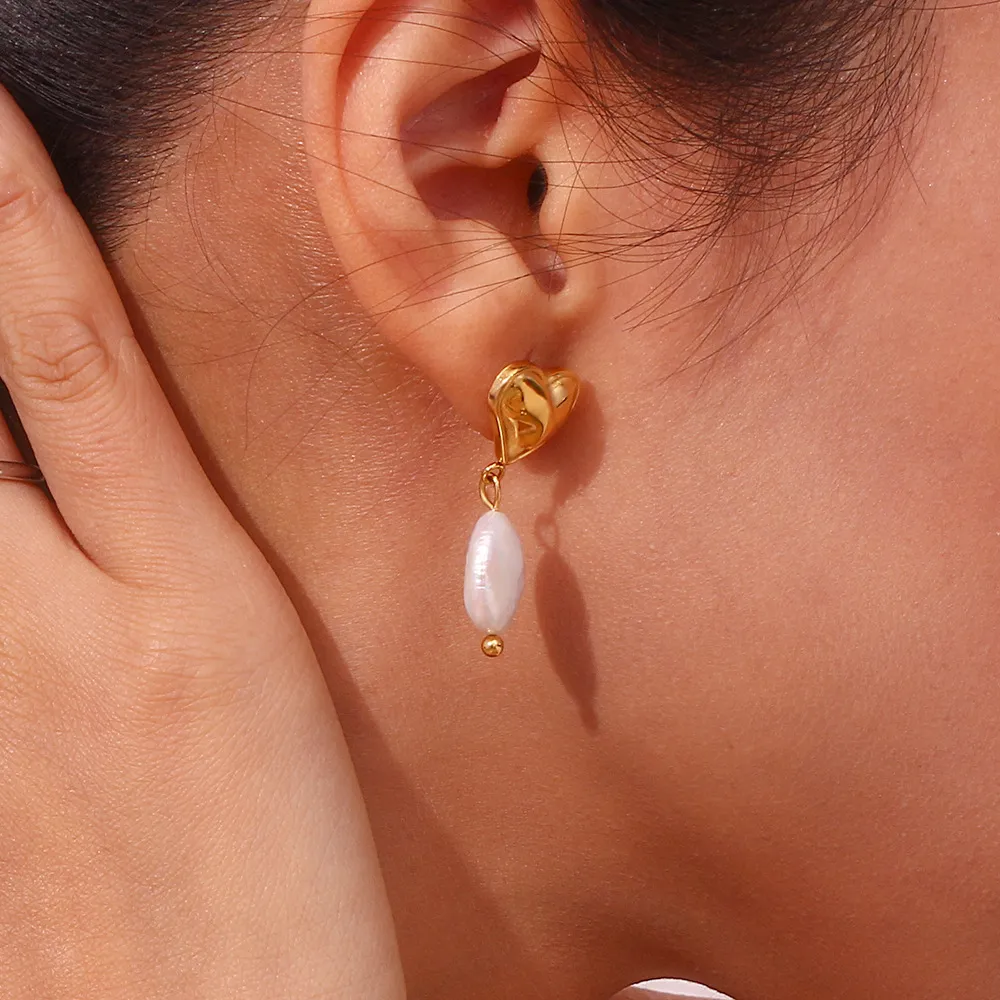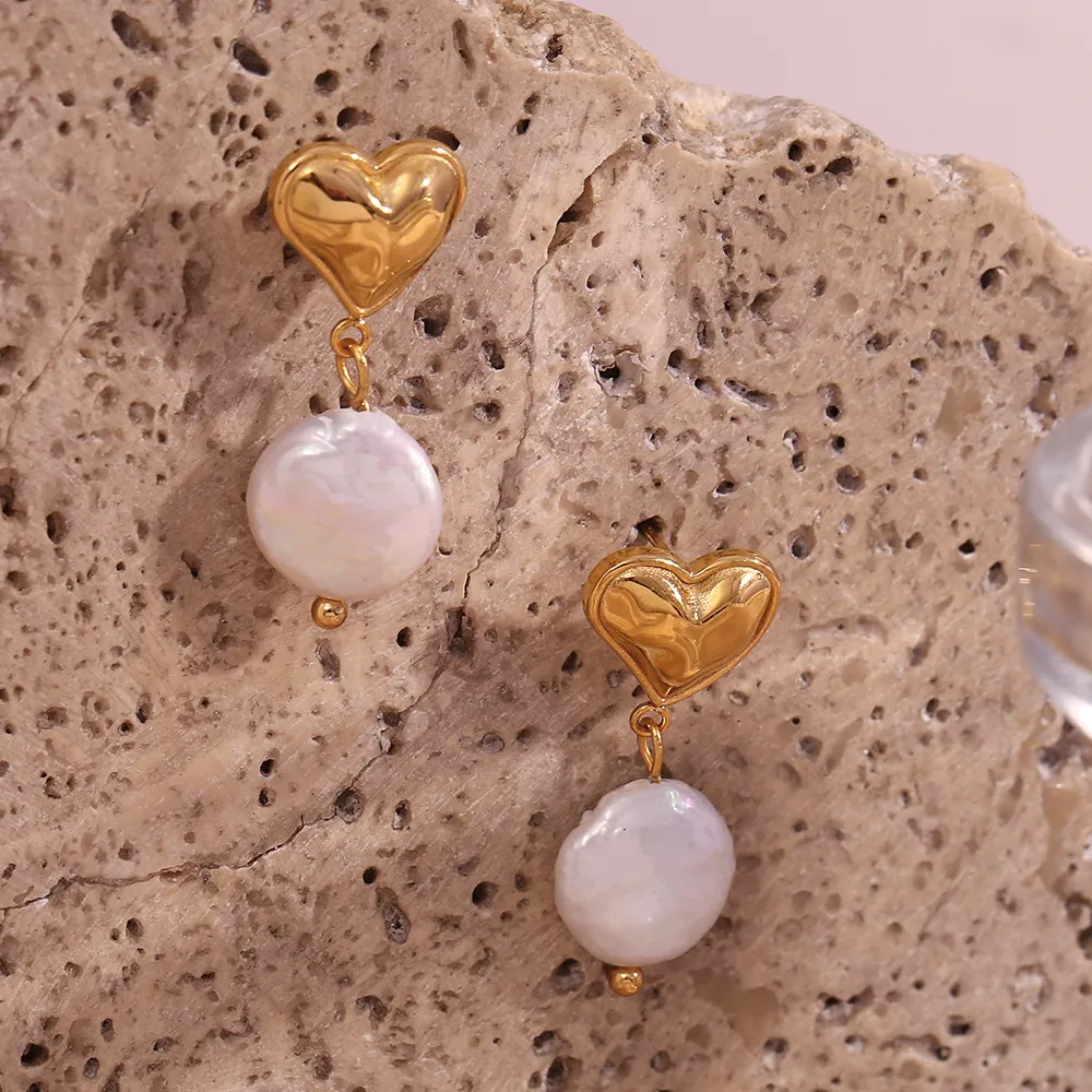 Color: Peach heart freshwater pearl pendant earrings-Gold