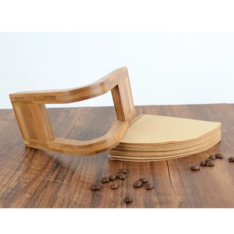 The coffee filter is well organized with a beautiful wooden filter holder.
