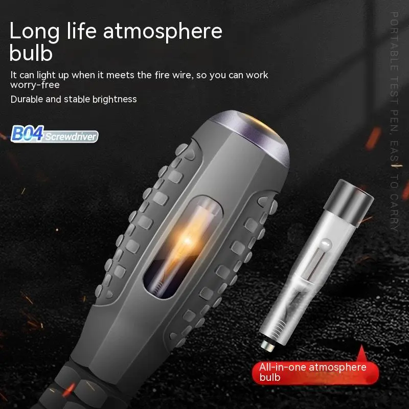 【Comfortable Grip】This electronic pen sensor features an anti-slip grip for more stable and safe use. Circuit Type: AC/DC; Display Mode: Neon Tube.【Dual-Use】Dual-purpose: one for measuring with the electric pen, and the other as a screwdriver. The screwdriver tip has slots for both flathead and Phillips at the ends of the metal rod. When pulling out the metal rod, insert it into the deepest position to achieve full contact.