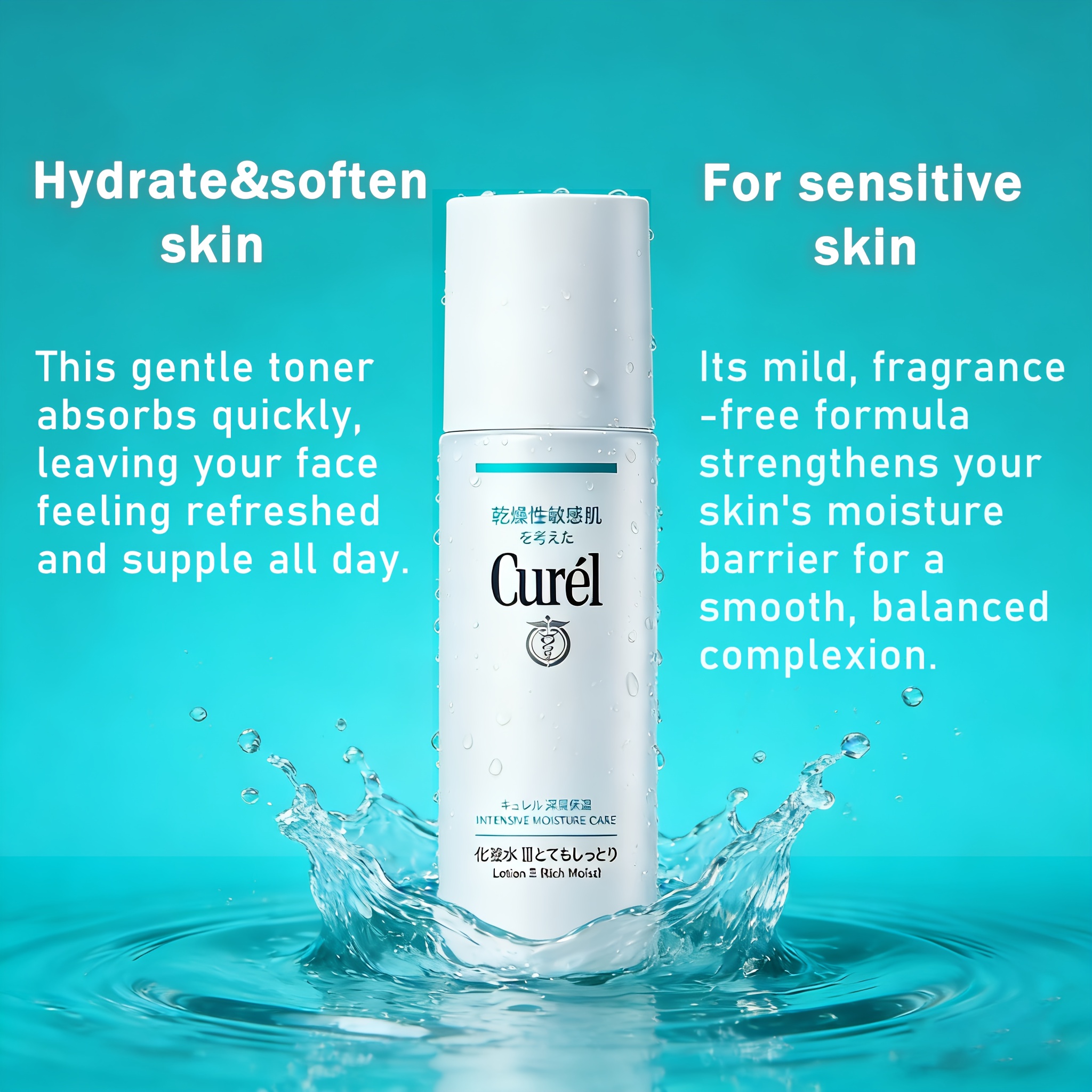 A deeply hydrating facial lotion formulated to deliver long-lasting moisture comfort for dry, sensitive, and easily dehydrated skin. The product shown is Curél Moisture Lotion III (Rich Moist), presented as part of Intensive Moisture Care and positioned as a “fundamental solution for sensitive skin.” This type of Japanese-style facial lotion functions as a lightweight, skin-prepping hydration step—applied after cleansing to condition the skin and support a healthier-looking moisture barrier.