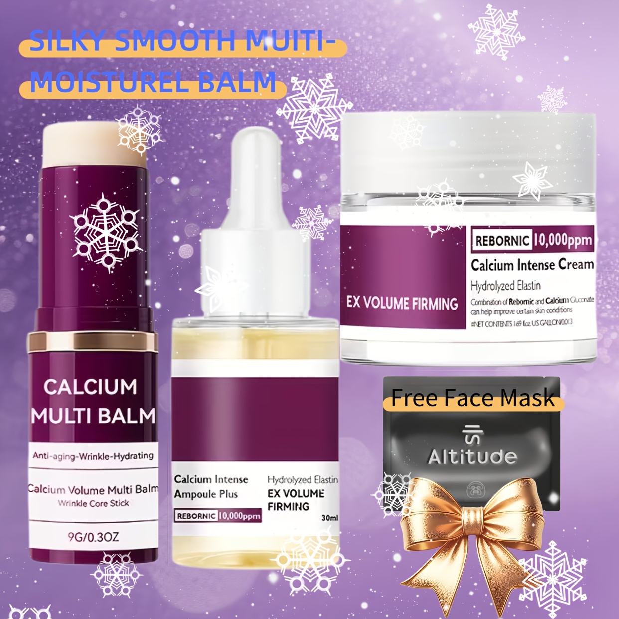 Build a simple, high-impact firming routine with the REBRONIC Calcium trio—designed to help skin feel silkier, more hydrated, and visibly smoother. This set combines a convenient multi balm stick for on-the-go moisture, a concentrated ampoule for elasticity support, and a rich intense cream to seal everything in for a plump, comfort-finish glow. Includes a free face mask for an extra boost when your skin needs it most.