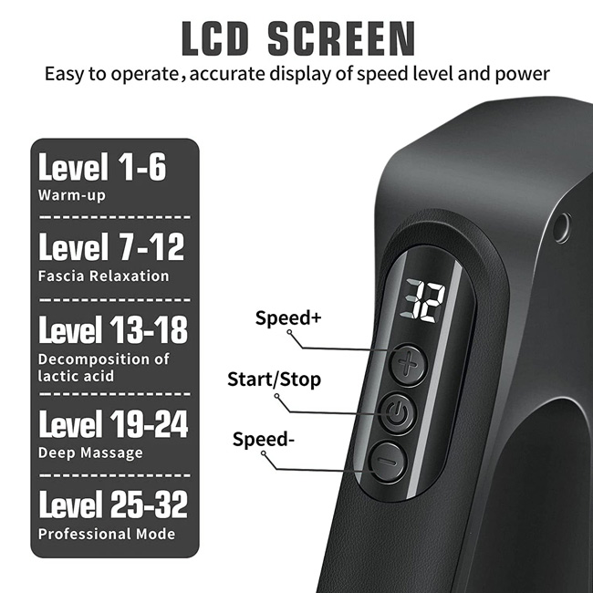 multiple massage sessions on a single charge. Simply recharge the battery via USB when needed, and your massage gun will be ready to go.