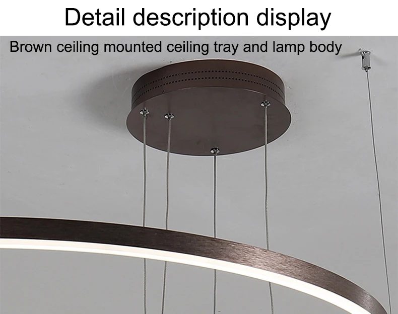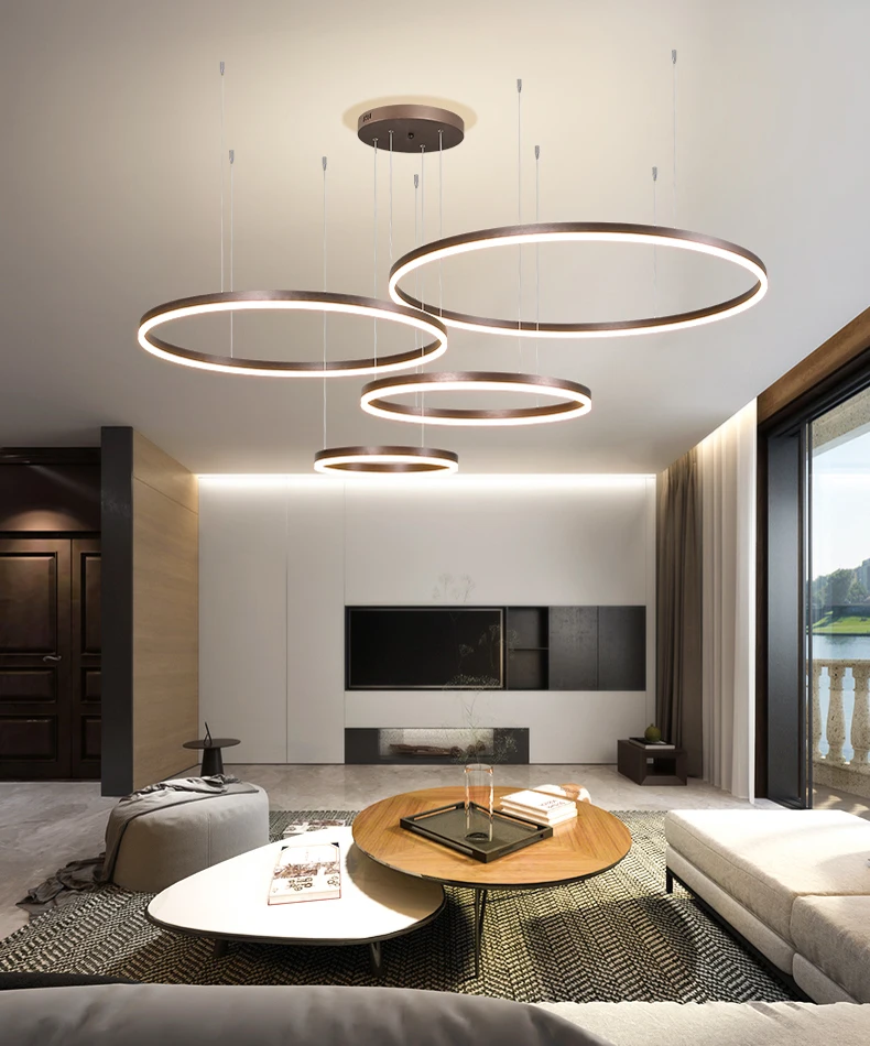 This 2023 modern LED chandelier features brushed rings and a ceiling-mounted design, offering a stylish lighting solution for any home. Available in gold and coffee color options, it adds a touch of elegance to living rooms, dining rooms, and bedrooms.
