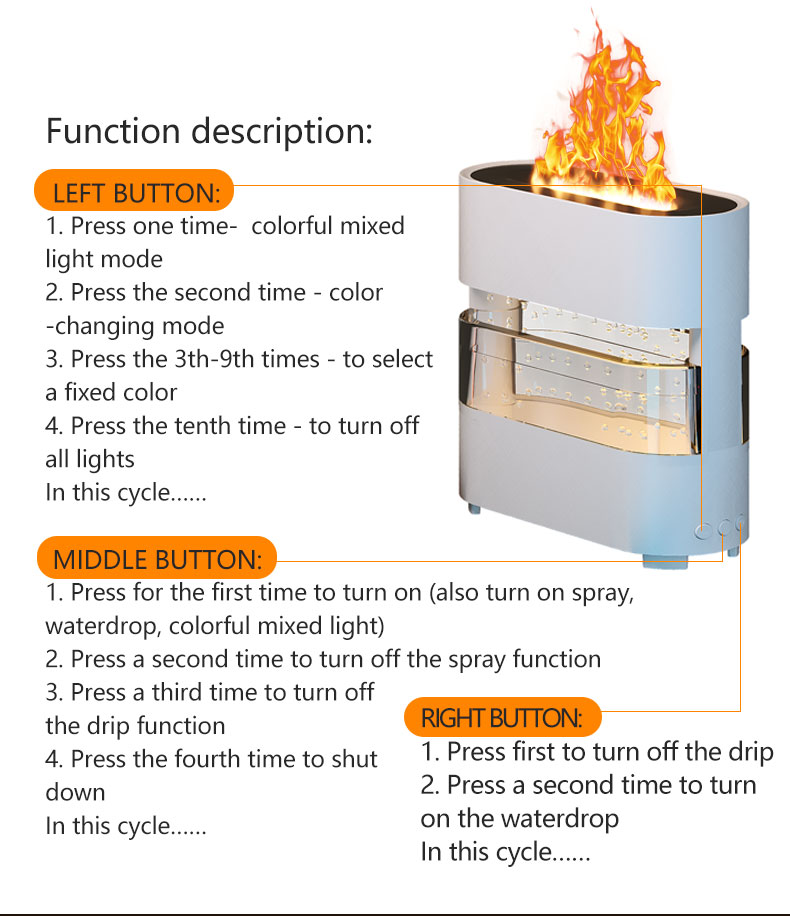 Simple operation: Press the middle button to turn on, and turn on the spray, raindrops, and flame colorful mode; the left button to switch