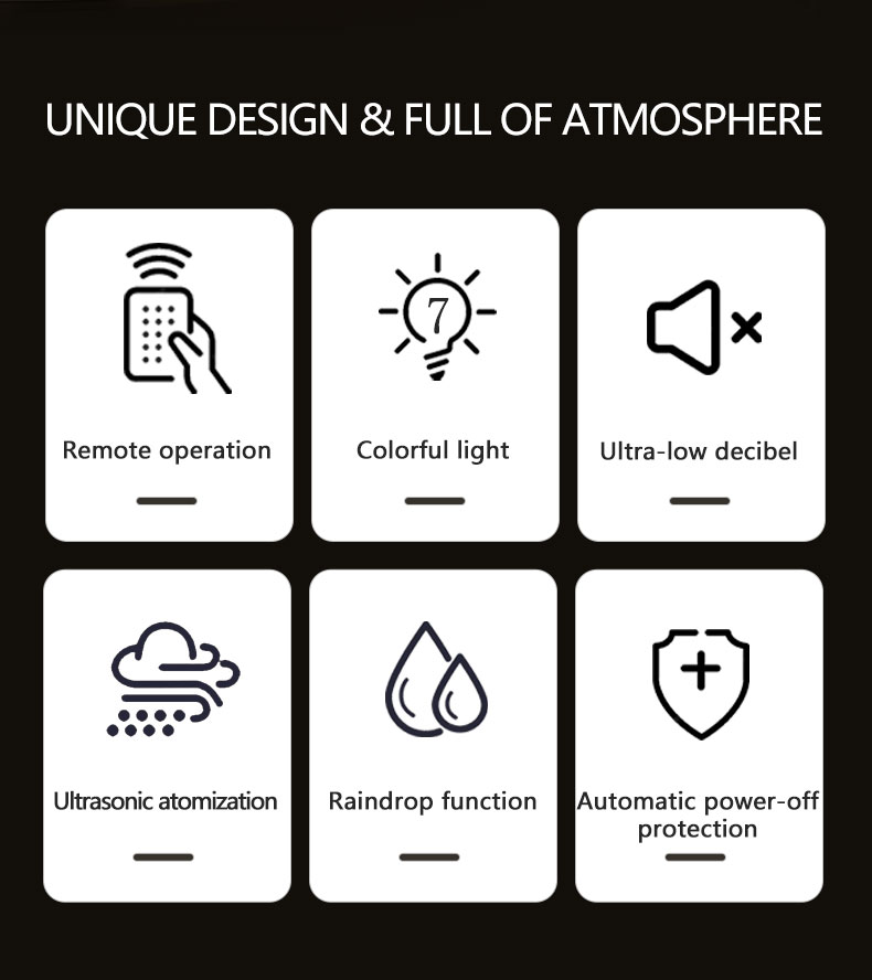 The humidifier+essential oil diffuser+flame effect: 3 -in -1 humidifier+essential oil diffuser+flame effect. The white noise of rain can help you fall asleep quickly, and you can add aromatherapy essential oils (need to bring your own essential oil) to provide aromatic fragrance The atmosphere of therapy.Realistic flame: The design effect of raindrops and simulation flames is more ritual. The flames are white, red, yellow, green, cyan, blue, purple and colorful. Can create a relaxed and comfortable atmosphere, which is conducive to sleep.