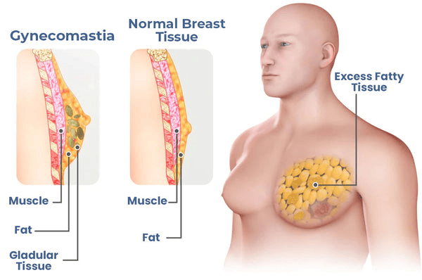 Gynecomastia is the enlargement of breast tissue in males. It occurs when there is an imbalance of hormones in the body, specifically an increase in estrogen levels or a decrease in testosterone levels. This can happen at any age, but it is most common during puberty and later in life.