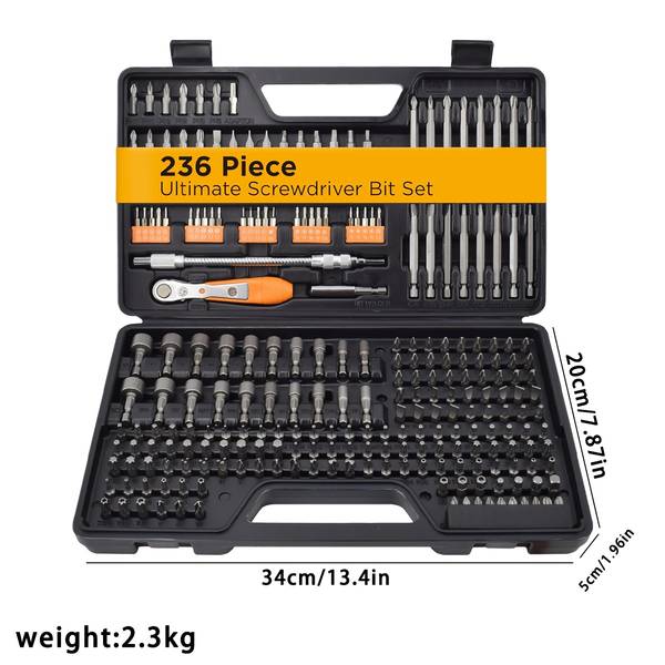 The 236pcs Screwdriver Bit Set is a must-have for anyone who regularly tackles home repairs, car maintenance, or DIY projects. With its comprehensive selection of tools, durable steel construction, and sleek toolbox, this set provides everything you need to get the job done right. Keep your repairs organized and efficient with this all-in-one tool kit.