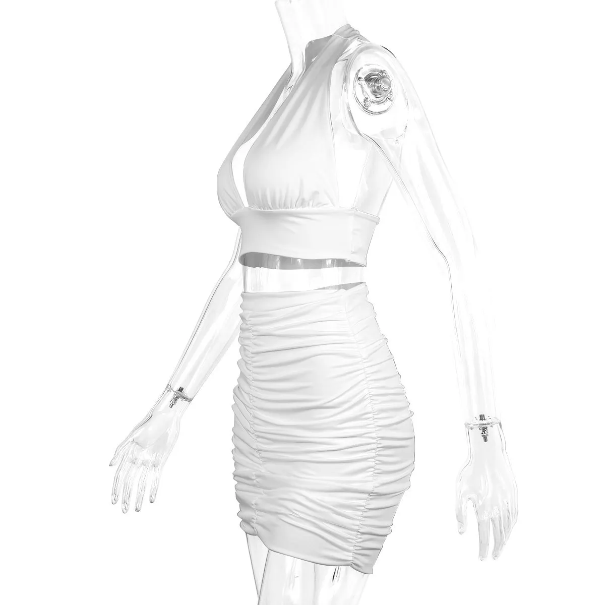 - ❥Features&Design:Sexy 2 Piece Outfits,Halter Crop Tank Top and Mini Skirt Set,Sleeveless,Off Shoulder,Self-Tie,Hollow Out,Ruched Bodycon Dress,Slim Fit,Pleated,Elastic.Summer Club Party Dress