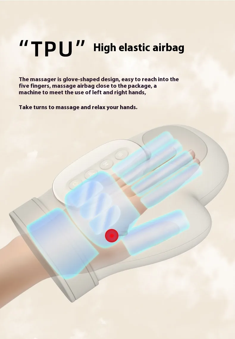 The device is designed to cradle the hand comfortably, applying controlled pressure across key areas including the palm, fingers, and wrist region. Its internal mechanism delivers rhythmic massage patterns that help relieve muscle tension, reduce stiffness, and promote relaxation. The structure is shaped to follow the natural contours of the hand, ensuring even coverage and consistent comfort during each session.