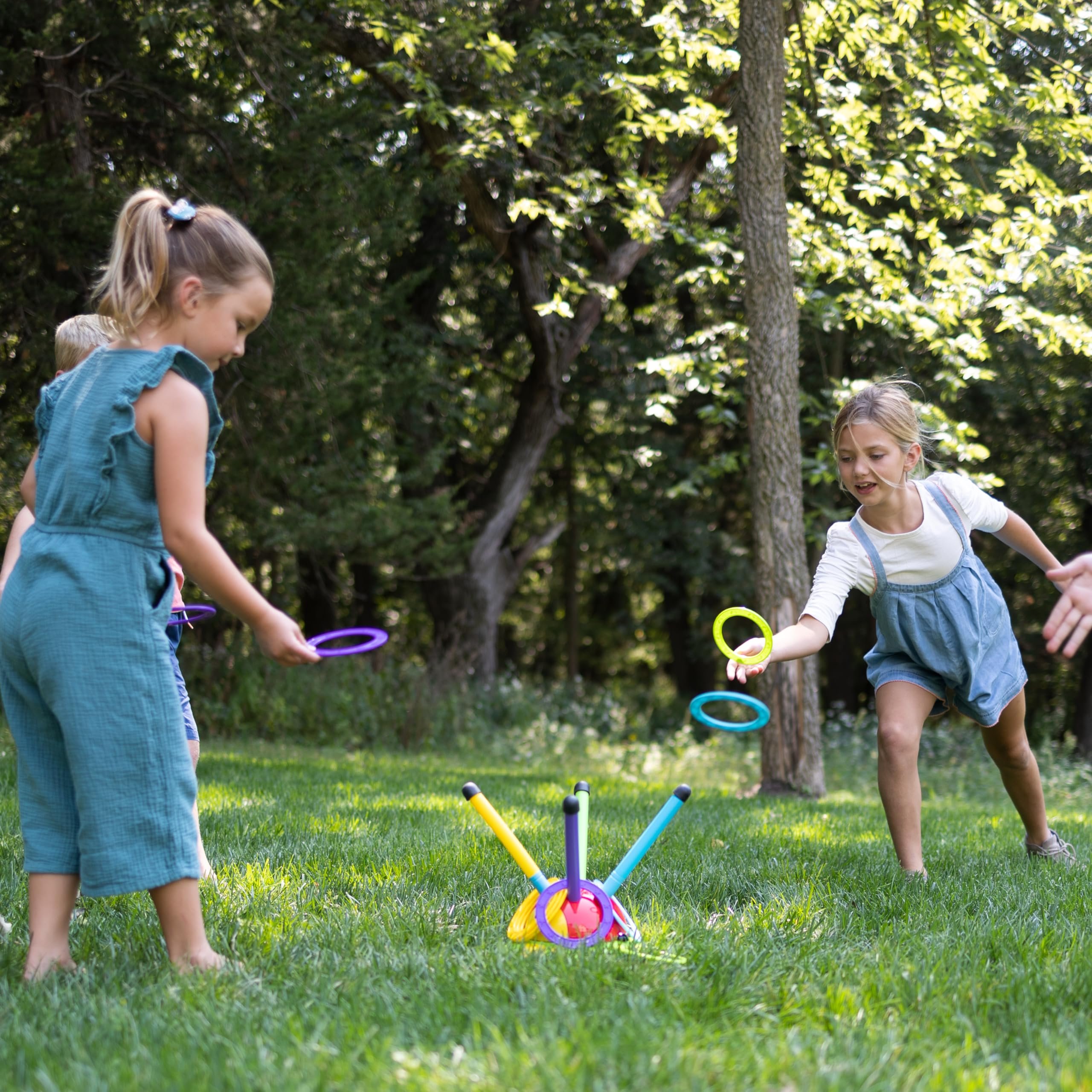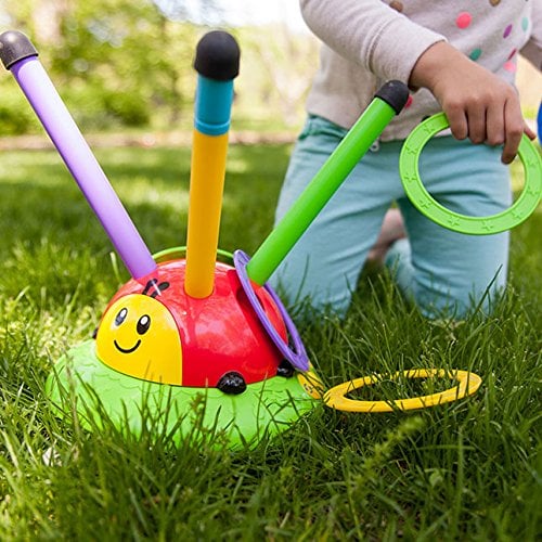 SPINNING POLE-HOPPING GAME that transforms into a spinning ring-toss game; endless active fun!