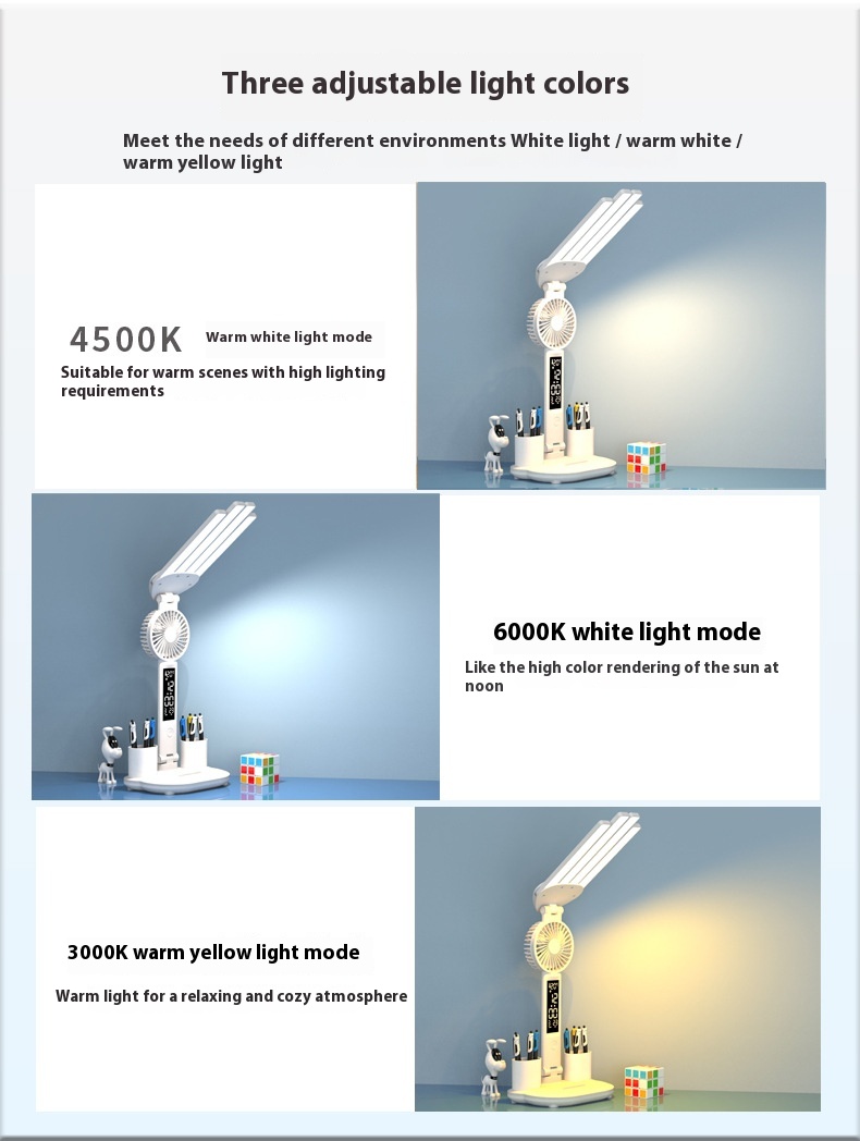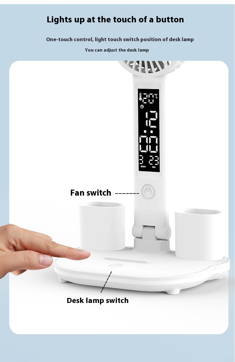 Elevate your workspace with our 3-in-1 Multifunction Table Lamp, a versatile and innovative lighting solution designed to meet all your needs. Featuring a four-headed folding design, this LED desk light comes with an integrated fan, calendar clock, and USB rechargeable capabilities. Perfect for home offices, study areas, and bedrooms, this multifunctional lamp provides optimal lighting and additional features to enhance your productivity and comfort.Overview: