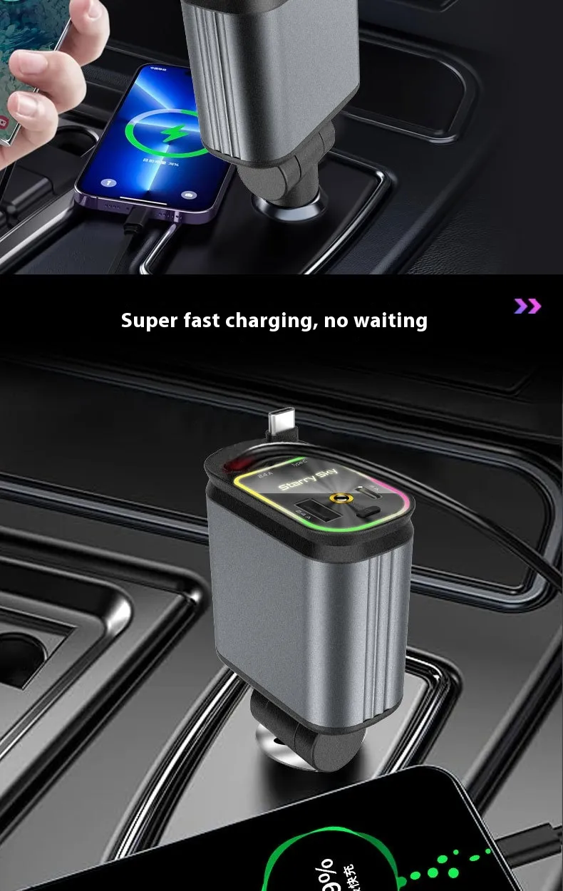 The retractable design keeps cables neatly stored when not in use, while the built-in starlight effect adds subtle ambient lighting to the car interior. This combination makes it both a practical charging hub and a decorative upgrade for your vehicle.