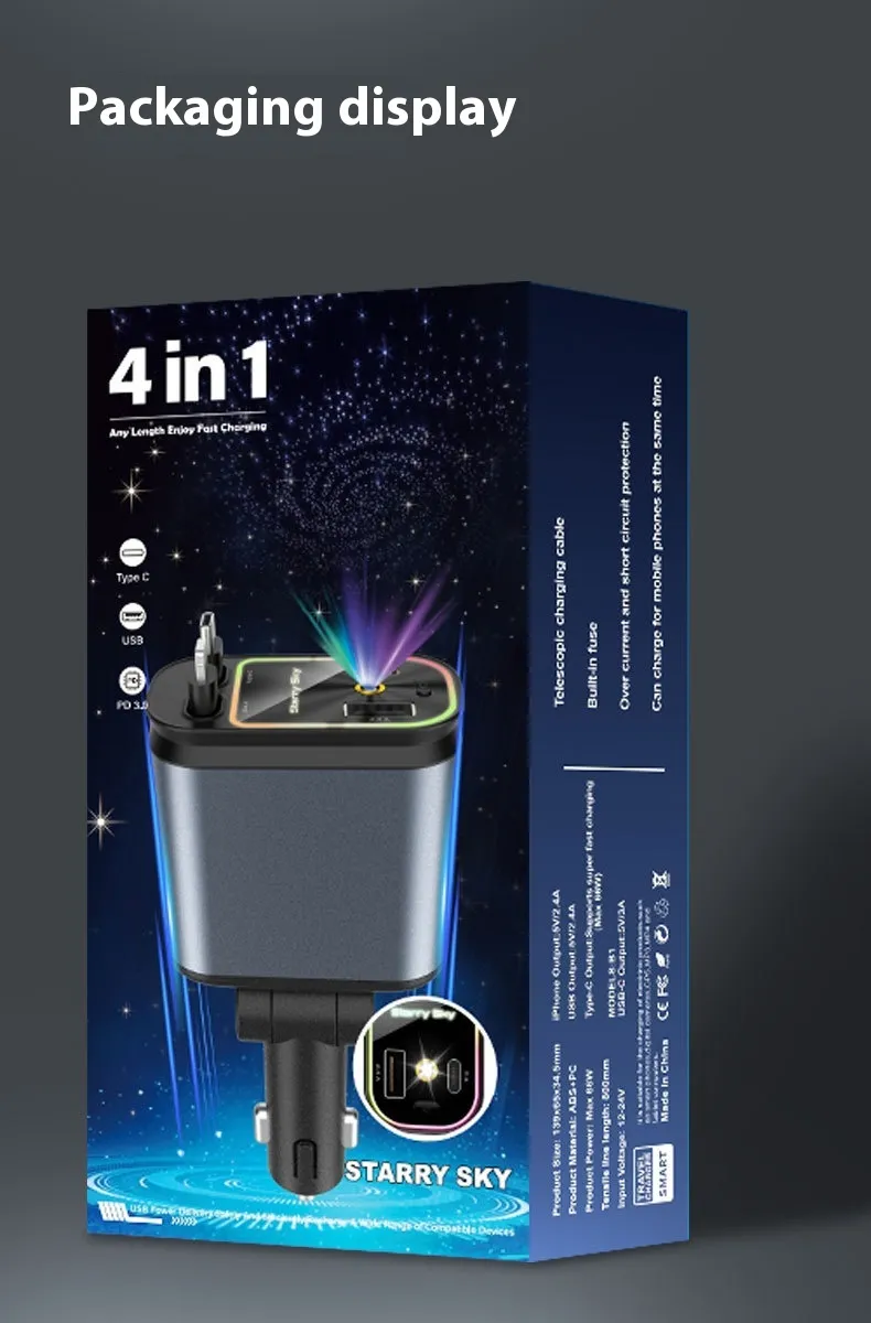 4 In 1 Retractable Car Charger Starlight – Fast Charging with Ambient Star Glow