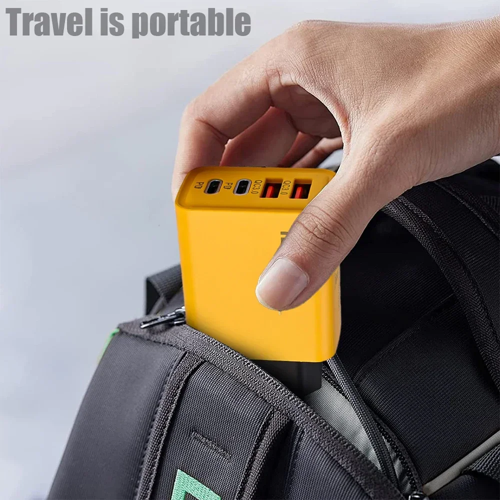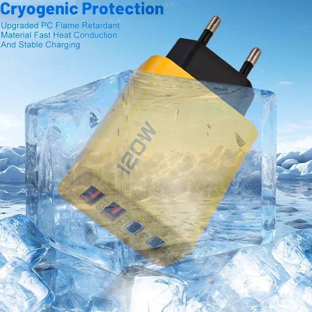 This 4-port 120W USB-C PD charger supports Quick Charge QC3.0 technology for fast and efficient charging. It is compatible with iPhone 15, 14, 13, Samsung, Xiaomi, and other devices, providing a reliable multi-device charging solution.