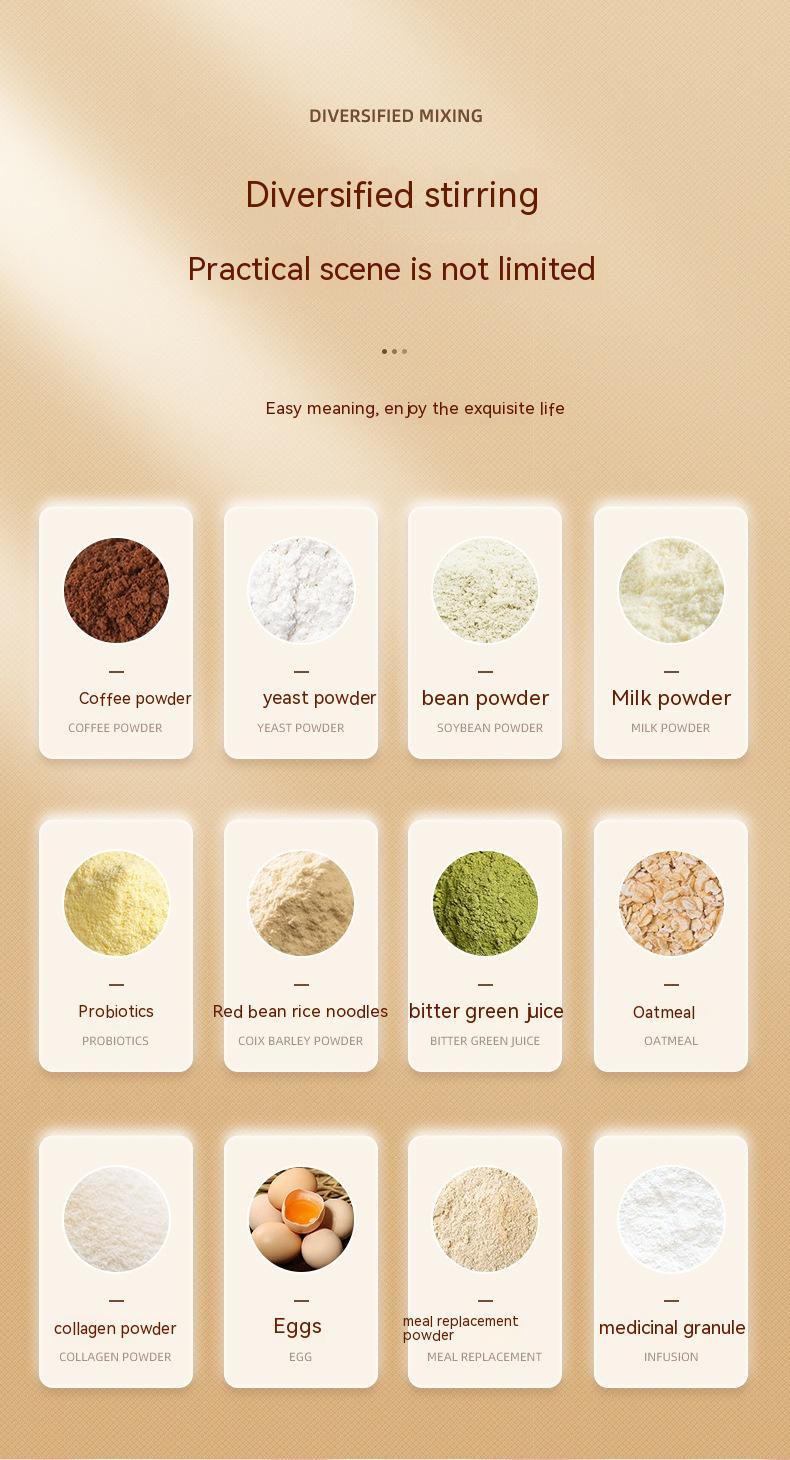 and thoroughly. It can easily stir viscous, granular liquids such as hot chocolate or oatmeal.
