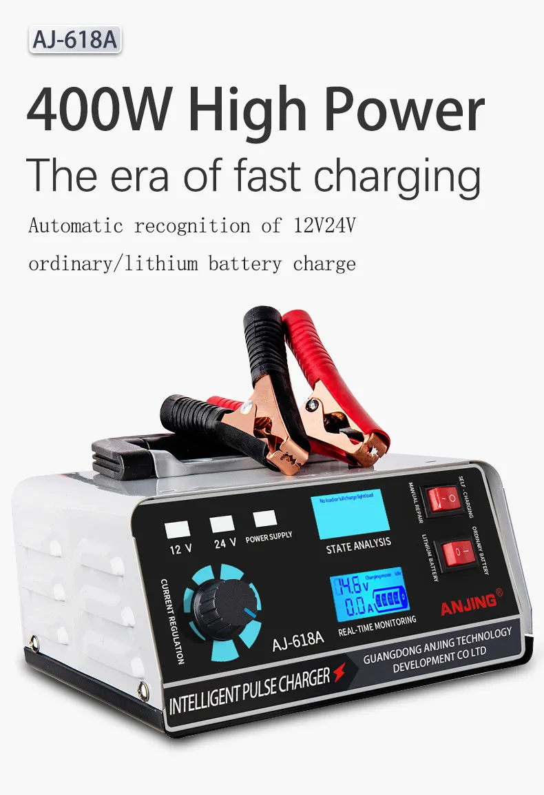 The 400W Automobile Battery Charger 12V/24V Pulse Repair High Power is a cutting-edge solution designed for fast and efficient battery charging and maintenance. Whether you own a car, truck, motorcycle, or boat, this high-power charger ensures optimal battery health, longevity, and performance. Featuring advanced pulse repair technology, it helps revive old or weak batteries, making it an essential tool for vehicle owners, mechanics, and professionals.