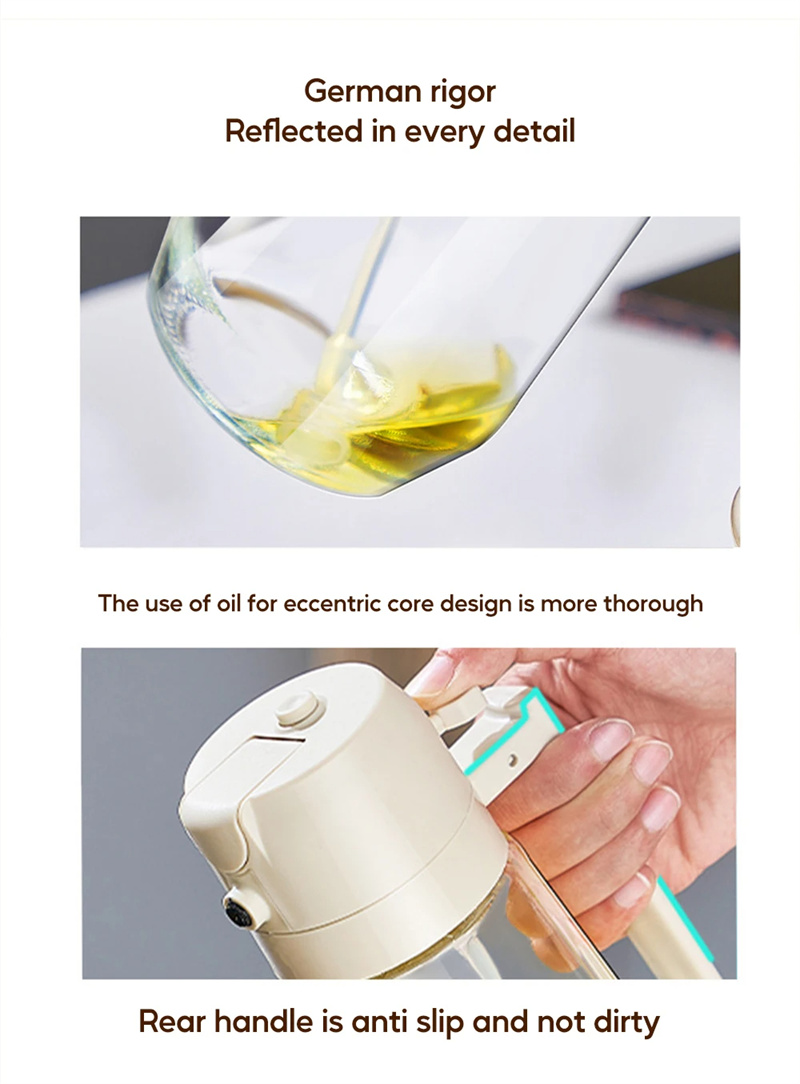 1. Dual Functionality: Our olive oil dispenser doubles as both a spray and a pour bottle, saving valuable kitchen space. Experience the versatility of one product that allows you to switch between spraying a fine mist and pouring a controlled stream of oil, depending on your cooking needs.