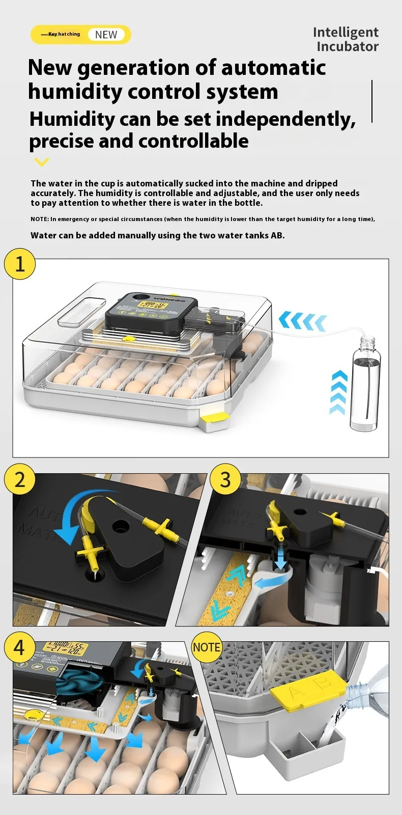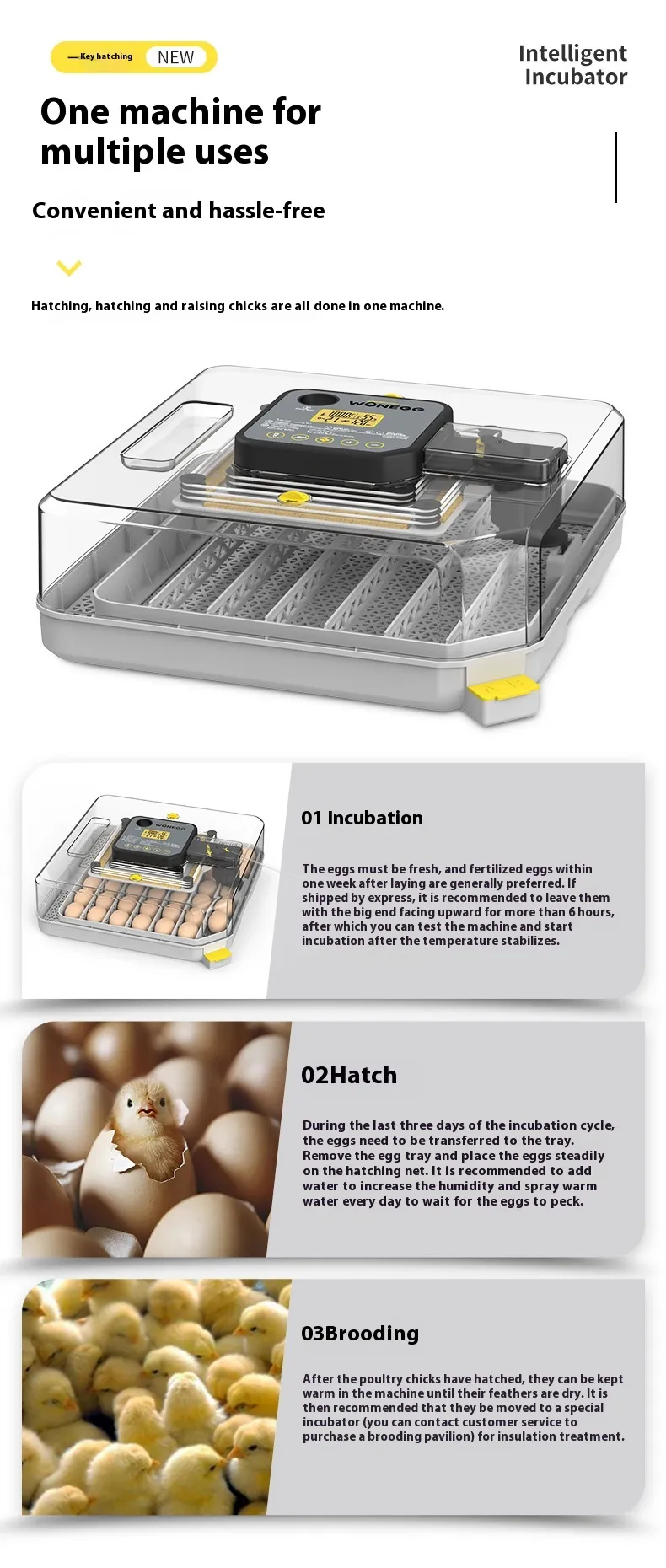 The 48 Pieces Egg Incubator with Automatic Humidity and Temperature Control is the perfect solution for poultry enthusiasts in New Zealand looking to hatch eggs efficiently at home. Designed for both beginners and experienced poultry keepers, this intelligent incubator ensures optimal hatching conditions for up to 48 eggs, making it ideal for those with small to medium-scale operations or families raising their own chickens, ducks, or other birds.