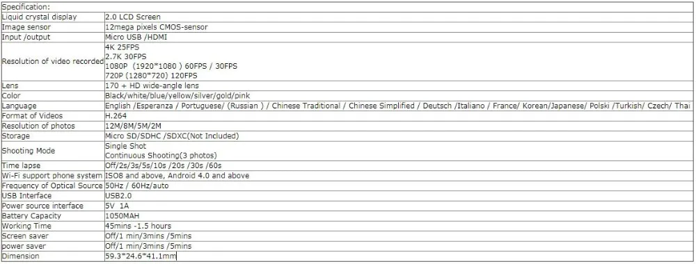 * 2.0 inch LCD screen * A water resistant casing that allows you to film fascinating water sports; water resistant up to 30 meters under water. * 12-megapixel HD 170 wide-angle lens. * Wi-Fi control range is 3m.Supported, Android /ISO APP * Support storage cards up to 32GB maximum * Multiple video recording formats: 4K/2.7K/1080p/720P * 4K only 25FPS, 2.7K only 30FPS. But most PC only accept video 1080P.So we suggest record by 1080P 60FPS, It is best and Most fluent. * This camera only can be used with good class 10 Memory card. Parameters: