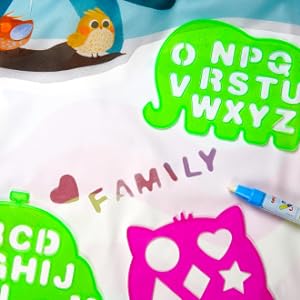 The drawing mat is printed with alphabet letters in eye-catching animal shapes, colorful shapes,number templates and geometric