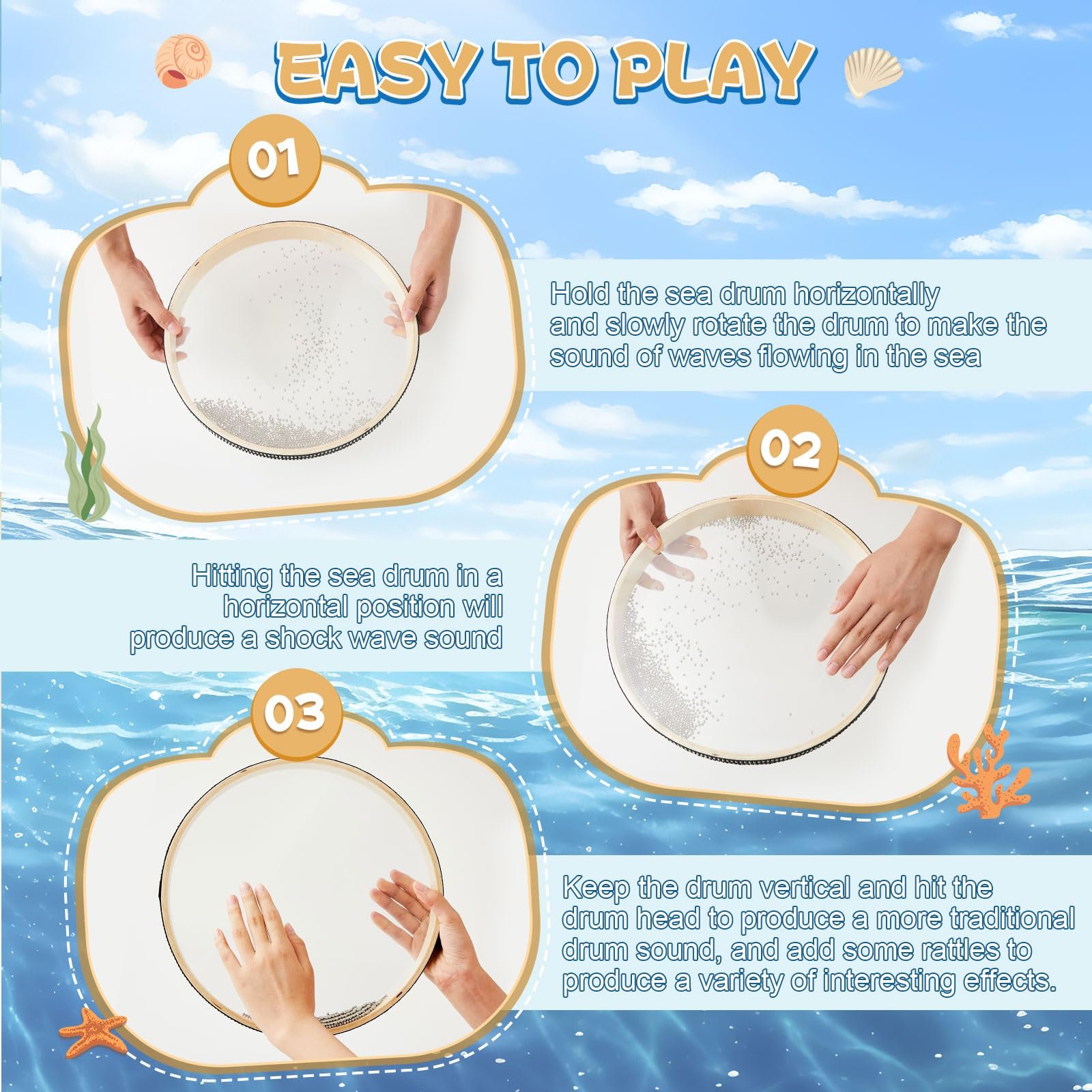 - Interesting Tools: the hand drum is funny and reliable, and you just tilt the drum horizontally to create the sound of waves, and beat the drum to simulate rough waves; And the drum can be served as ideal education tool to help develop your musical potential and train coordination, and can stimulate their interest in sound and music