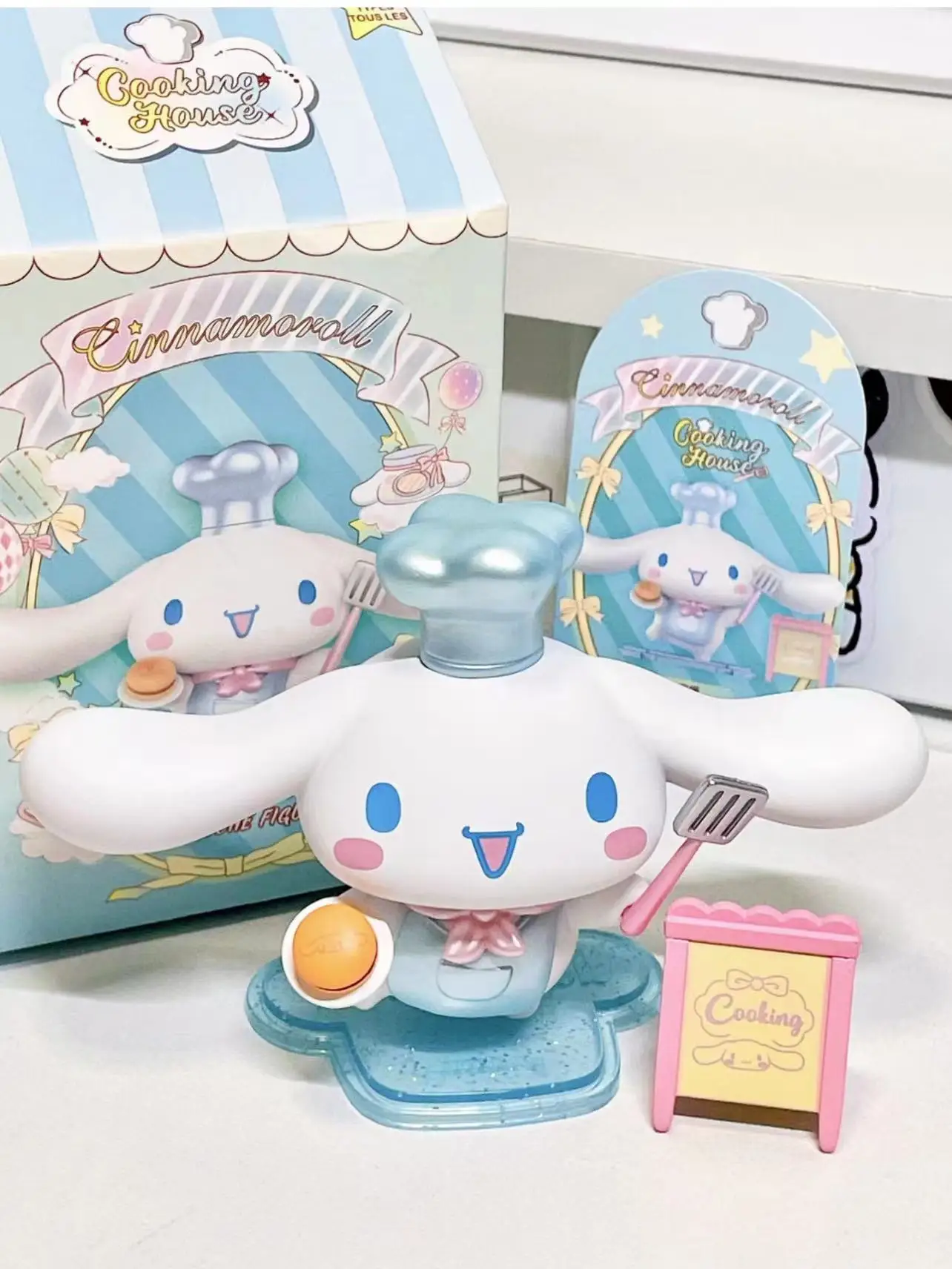 - Design: Each blind box features a surprise Cinnamoroll doll model, beautifully designed with intricate details that capture the essence of this beloved Sanrio character. The dolls are dressed in cute cooking-themed outfits, adding a playful twist to the collectible figures.