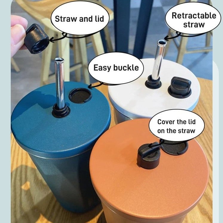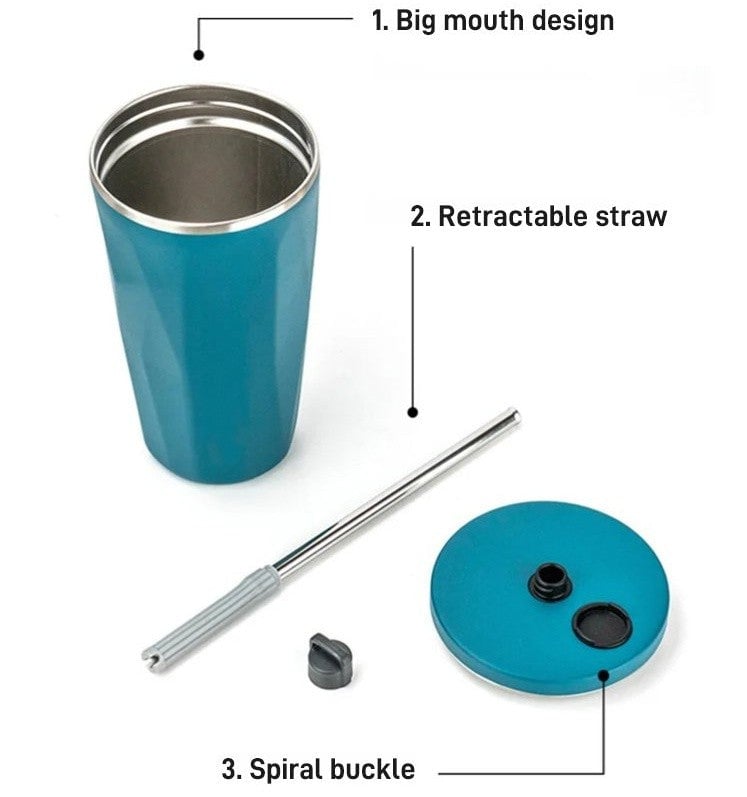Coffee Cup with Straw and Lid - A retractable straw, with silicone part at the bottom. This allows the straw to retract back into the mug when not in use or bounce out of straw hole when in use. The lid of the cup is designed to a spiral buckle, and has a straw hole with a lid. The straw lid is designed to fit onto a specially equipped lid buckle when straw is in use, and screwed onto the straw hole when straw is not in use.