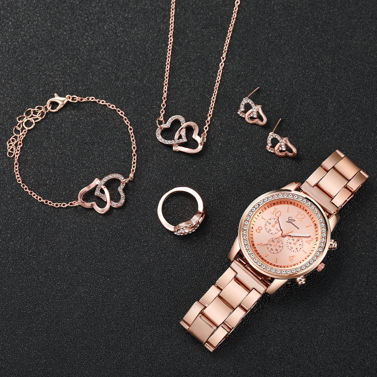 6PCS Women's Fashion Watch & Jewelry Set Rhinestone Stainless Steel Quartz Watch with Double Heart Design