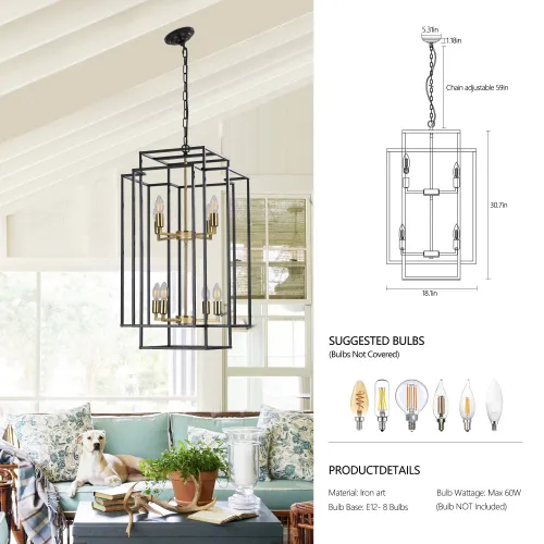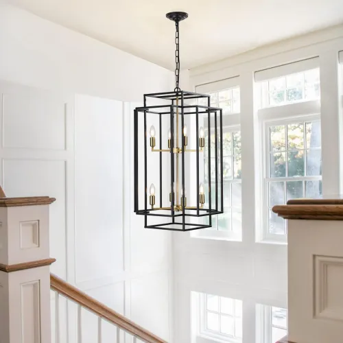 Opting for the 8-Lights Black & Gold Lantern Tiered Chandelier means investing in a lighting fixture that offers both beauty and practicality. Its versatile design ensures it complements various décor styles, while its durable construction promises long-lasting use. Whether you're looking to make a statement in your entryway or add elegance to your dining area, this chandelier serves as a functional art piece that elevates your space.