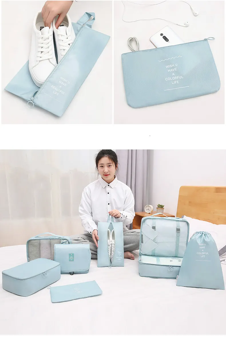 Shop the 8-piece Set Luggage Divider Bag for efficient travel storage. Organize clothes, shoes, underwear, and accessories with these packing cubes. Perfect for business trips, family vacations, and more!