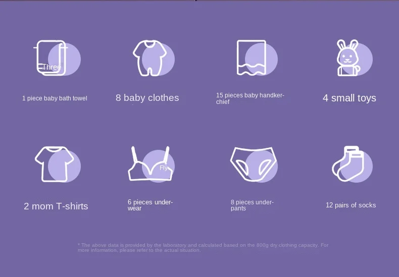 One washable: 1 baby bath towel&8 baby clothes&15 baby sweaters&4 small toys&2 mother T-shirts&6 underwear&8 underwear&12 pairs of socks (Above data provided by the laboratory to 800 g driven cloths capacity calculation, specific please refer to our actual.)