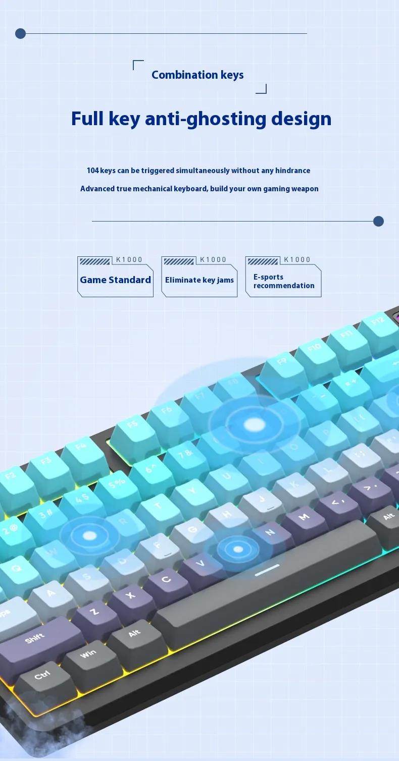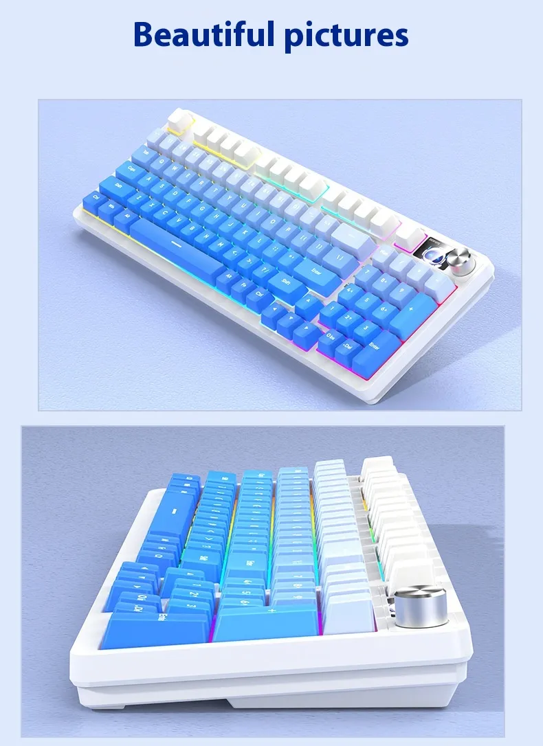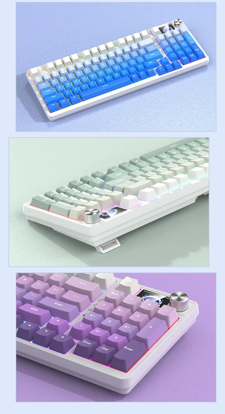 Equipped with three connectivity modes, including Bluetooth and wired options, it allows users to switch between devices effortlessly. Its mechanical-style keys provide tactile feedback for a comfortable typing experience, while the compact 98-key layout saves desk space without compromising functionality.