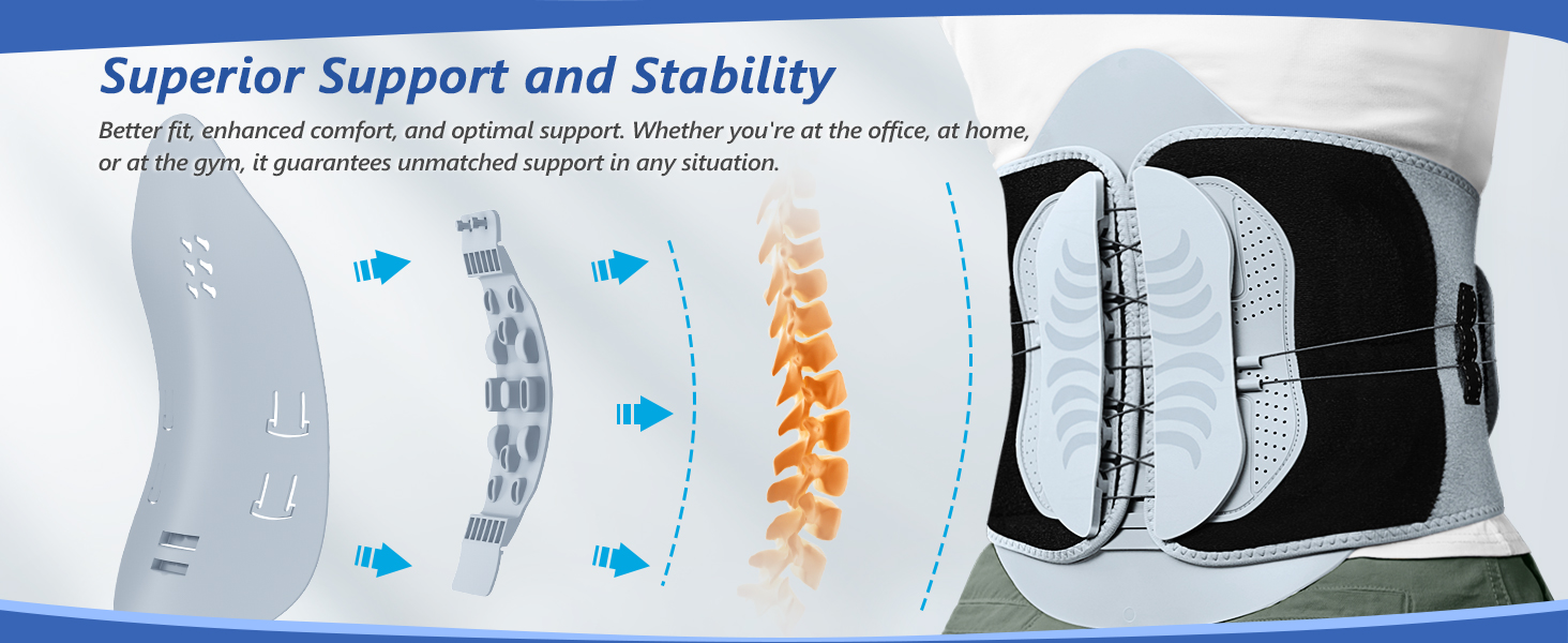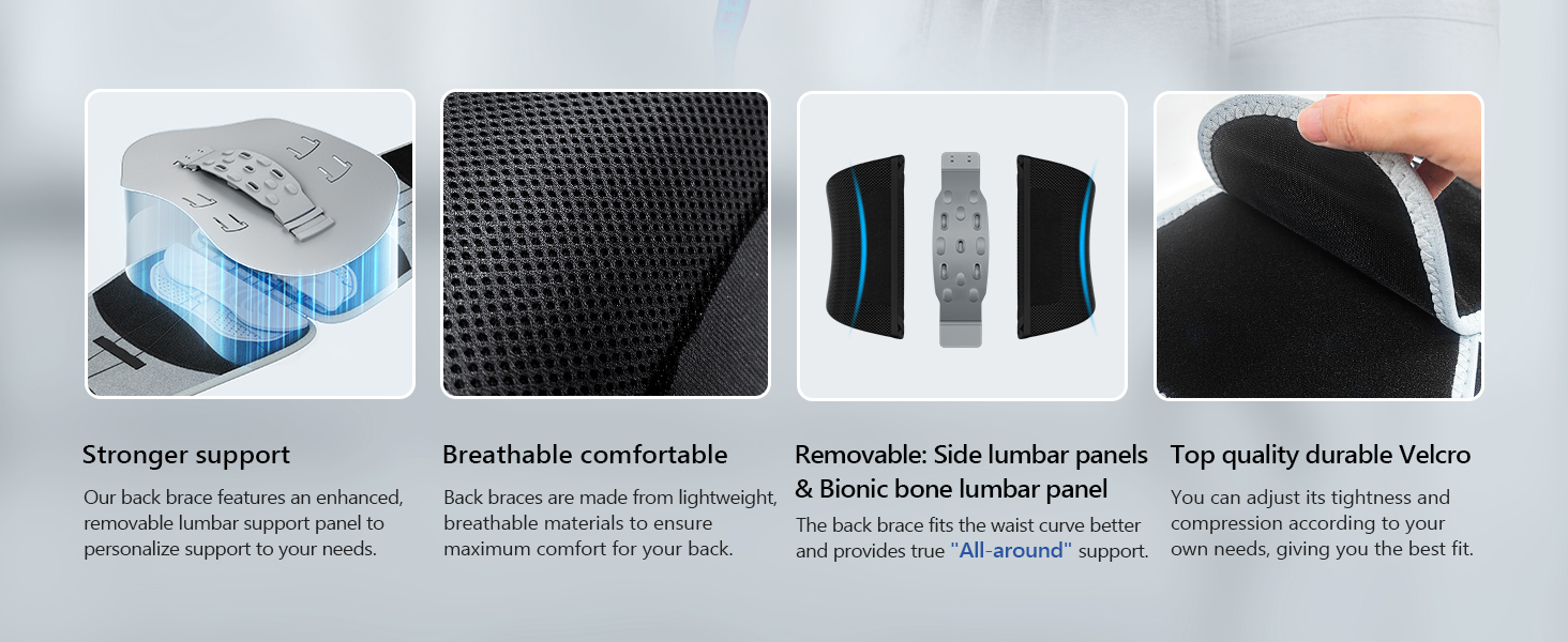 - 【Superior Support and Stability】The lower back brace uses a next-generation ergonomic support system (including 1 removable lumbar support panel + 2 removable side lumbar support panels + 1 removable bionic bone lumbar panel) . Whether you're recovering from an injury or dealing with chronic lower back issues, it provides the strongest lumbar support. It not only improves spinal curvature and relieves muscle tension-related pain but also ensures that your torso remains stable during activity.