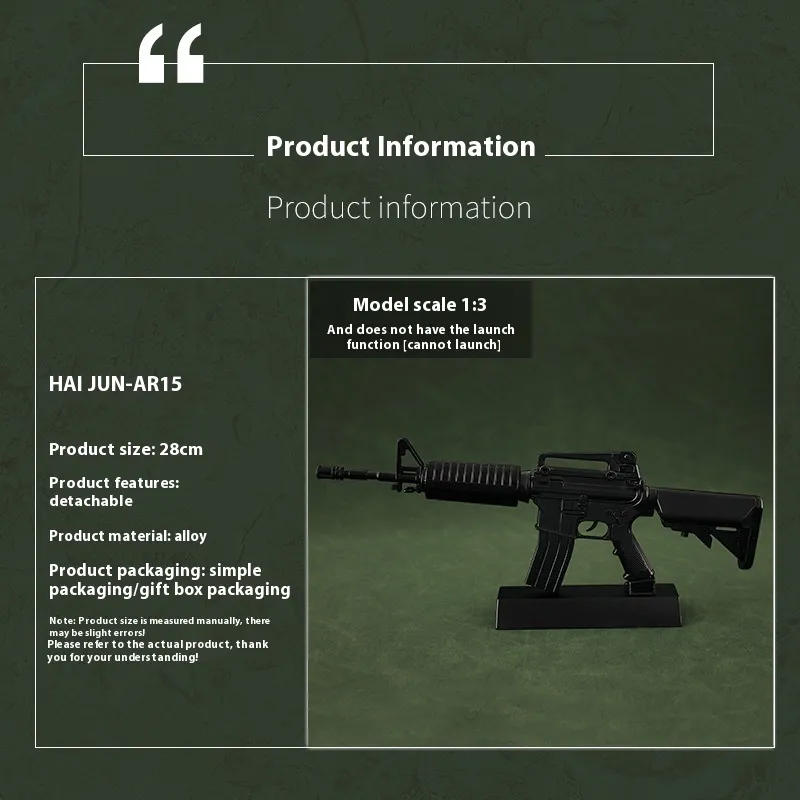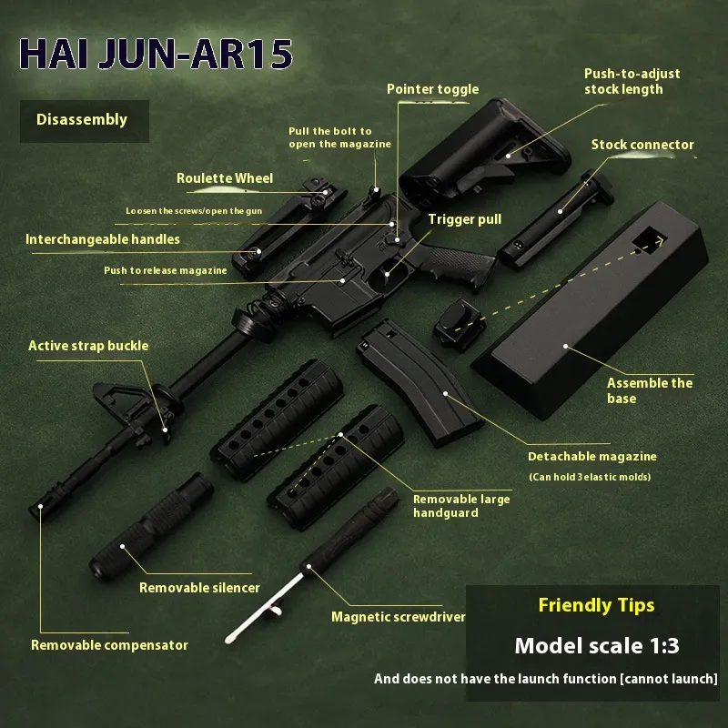 The Alloy Military Model Detachable Metal Gun Toy is designed with both collectors and casual users in mind. While it offers a true-to-life look, the model is also crafted to be safe for handling and display. It’s the perfect choice for those who appreciate both aesthetic beauty and functional design. Whether you’re showcasing it as a decorative piece or simply using it for play, this alloy gun toy provides a satisfying, realistic experience.