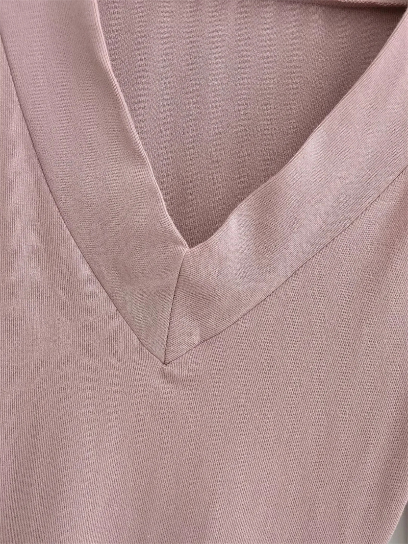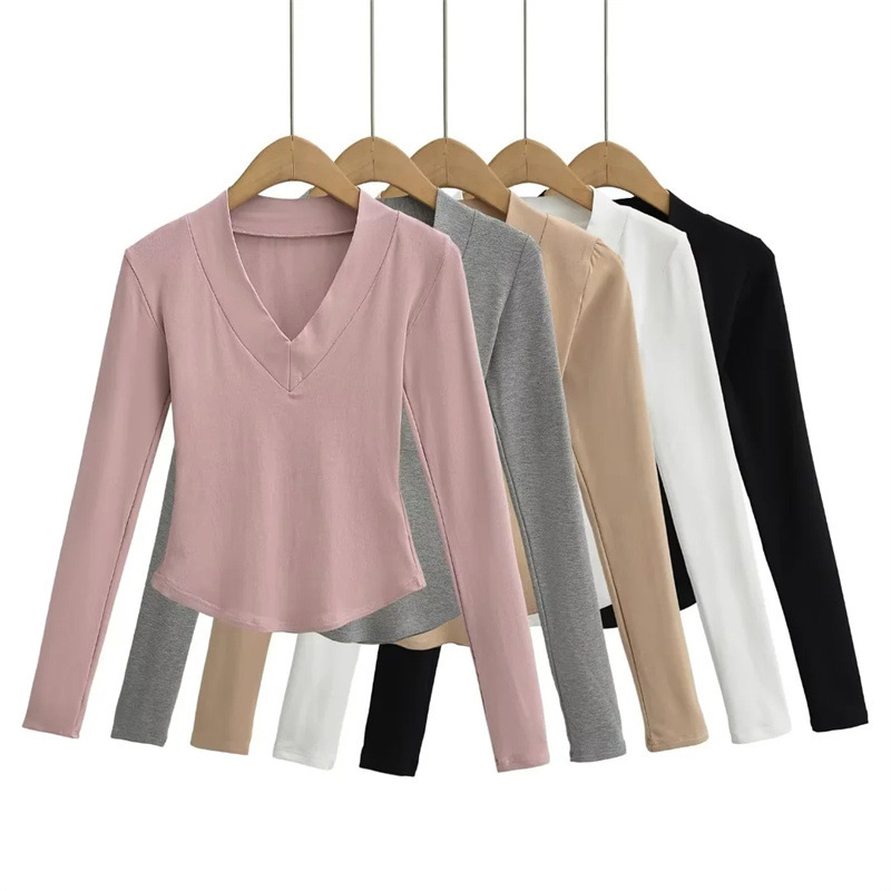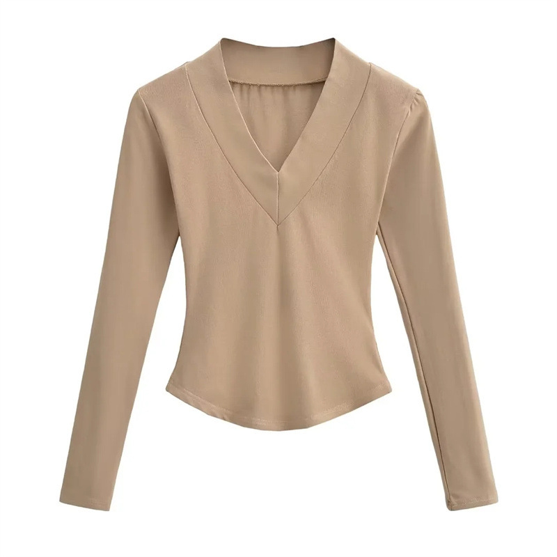 The tee's design focuses on a universally flattering V-neckline that gracefully frames the face and elongates the neck, making it perfect for displaying a touch of personal style with layered necklaces or a bold pendant. Adding to its unique charm is the curved hemline, which contours subtly to enhance the body's natural line while offering versatile styling options. This thoughtful design allows for the tee to be effortlessly stylish whether tucked into high-waisted pants for a sleek silhouette or left untucked for a more relaxed, breezy look.