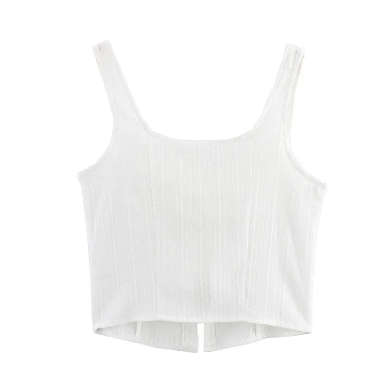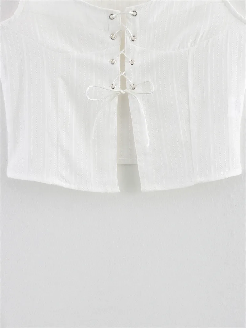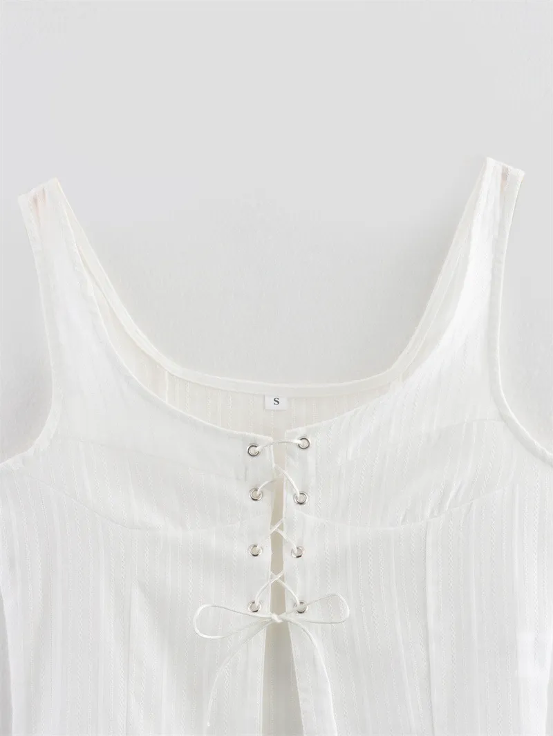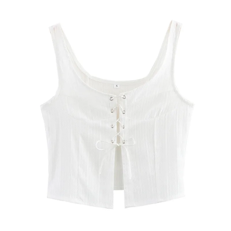 American Style Trendy Solid Color White Strap Top with Rope Sleeveless Short