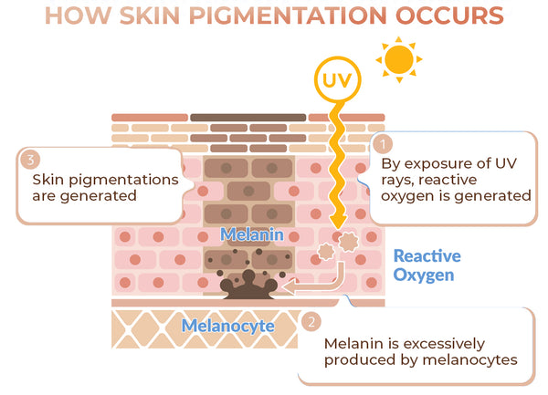 Skin pigmentation occurs due to the presence of a pigment called melanin in the skin. Melanin is produced by cells called melanocytes, which are found in the lower layers of the skin. The amount of melanin produced by melanocytes is determined by a number of factors, including genetics, hormones, and environmental factors.