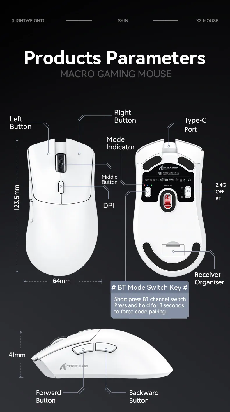 The Attack Shark Wireless Bluetooth Three-model Lightweight Mouse offers an impressive combination of flexibility, comfort, and precision, making it an essential tool for both gamers and professionals. Its three connectivity modes, lightweight design, and precision sensor ensure a smooth and efficient experience whether you're working on spreadsheets, playing competitive games, or designing graphics. The customizable RGB lighting adds a touch of style, while the durable construction ensures that this mouse will serve you reliably for years to come.