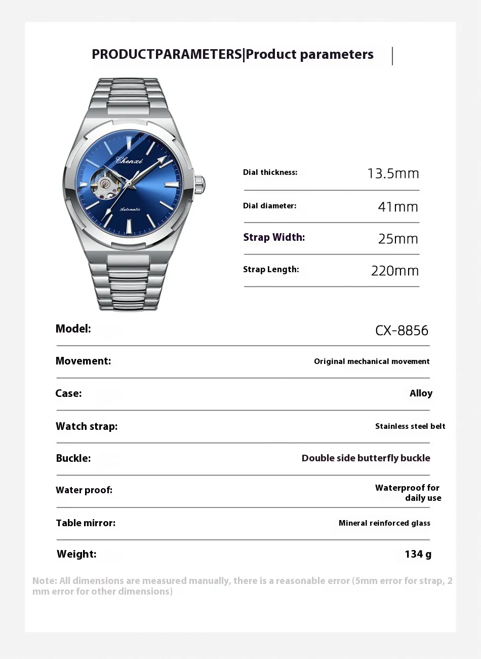 An automatic mechanical watch is more than a timepiece; it's a statement of style, precision, and craftsmanship. Perfect for the modern individual who values elegance and timeless design, this watch is a must-have accessory for any occasion. With its intricate mechanics, trendy design, and durable build, it stands as a testament to the beauty of functional artistry.